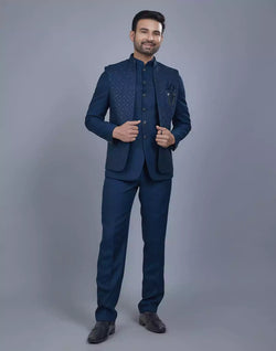 Image of Blue Self Weaved Jacquard Bandhgala Set - South India Shopping Mall Image of Blue Self Weaved Jacquard Bandhgala Set - South India Shopping Mall