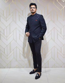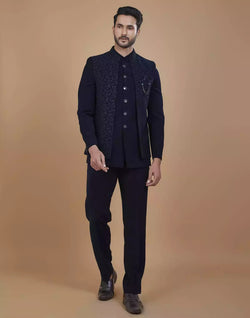 Image of Navy Blue Elegant Cutdana Velvet Bandhgala Set - South India Shopping Mall Image of Navy Blue Elegant Cutdana Velvet Bandhgala Set - South India Shopping Mall