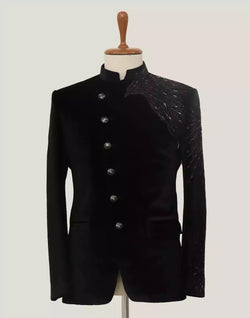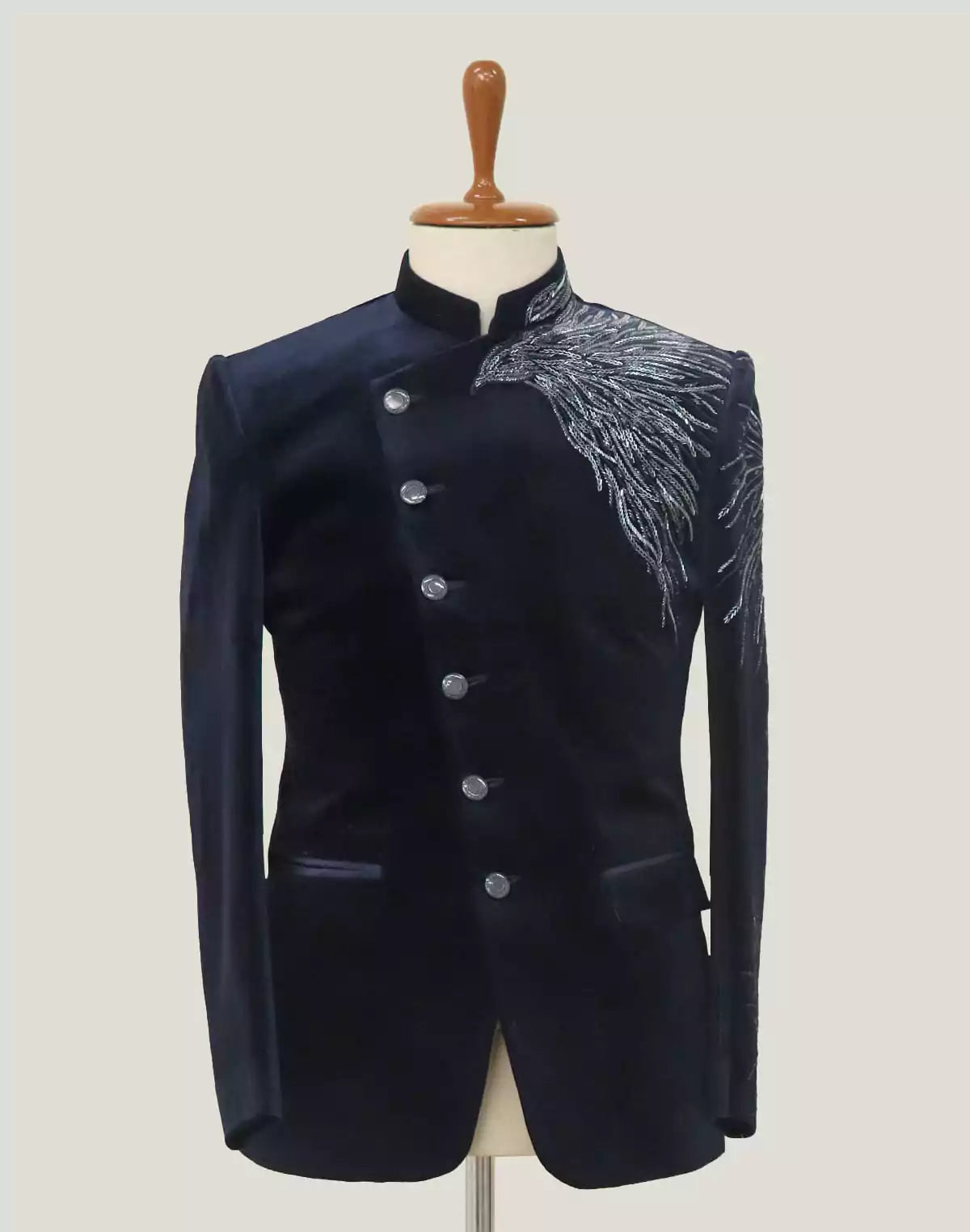 Image of Cutdana work Velvet Eagle Style Navy Blue Bandhgala Suit - South India Shopping Mall Image of Cutdana work Velvet Eagle Style Navy Blue Bandhgala Suit - South India Shopping Mall
