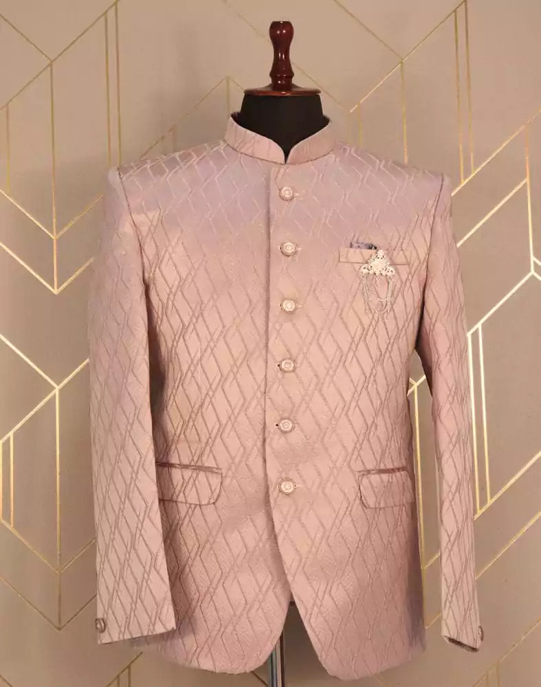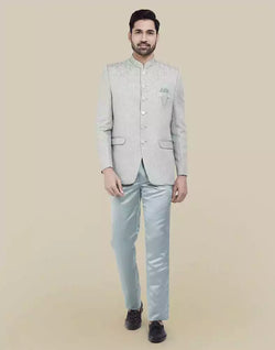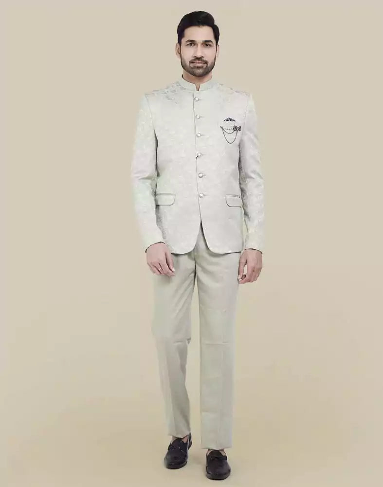 Image of Grey Self Weaving Patterned Jacquard Bandhgala Suit - South India Shopping Mall Image of Grey Self Weaving Patterned Jacquard Bandhgala Suit - South India Shopping Mall