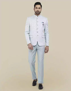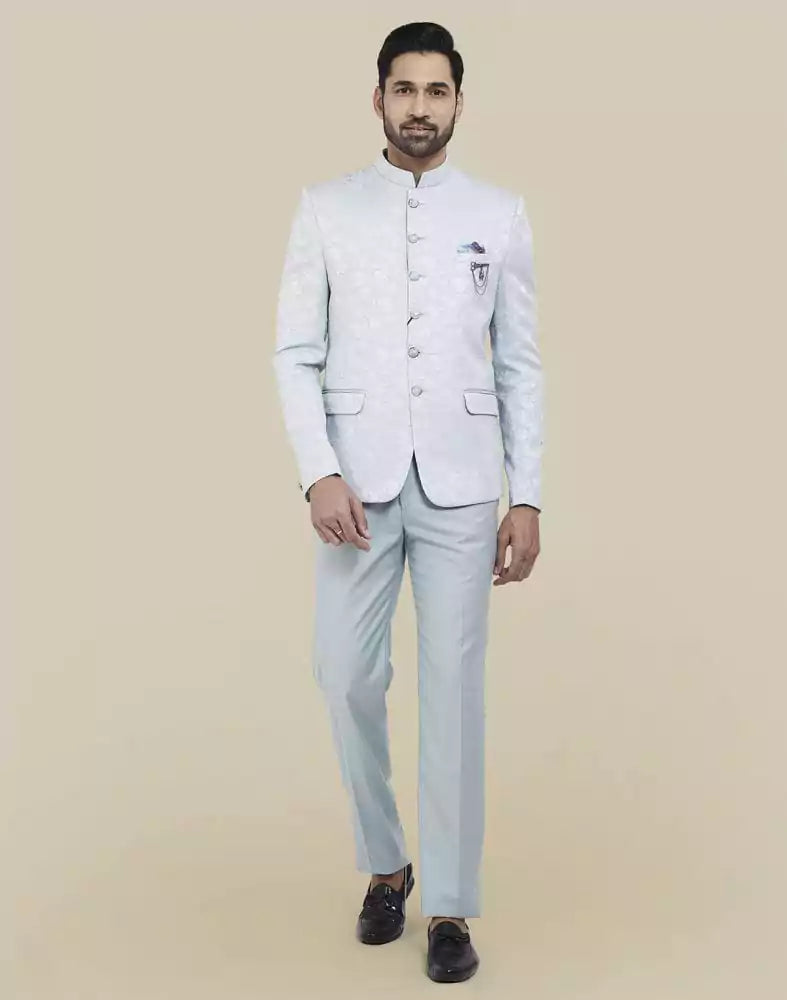 Image of Sky Coloured Self Weaved Jacquard Bandhgala Suit - South India Shopping Mall Image of Sky Coloured Self Weaved Jacquard Bandhgala Suit - South India Shopping Mall