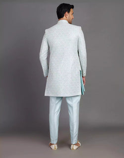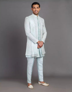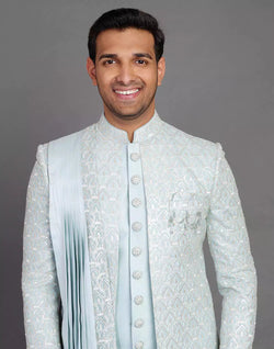 Elevate your style with our All Over Sequence work Raw Silk Indo-Open Jacket Set with Dupatta! Made from luxurious raw silk fabric, this set features intricate sequence work all over for added glamour. The jacket is designed in a modern indo-open style, perfect for any occasion. Complete the look with the matching dupatta for a touch of elegance.