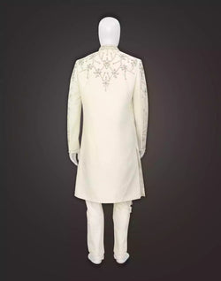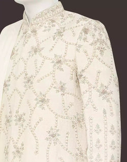Elevate your style game with our stunning floral Indo Western set! Crafted from luxurious raw silk, this white beauty features intricate Zardosi work that is sure to turn heads. Complete with a matching dupatta and chudidar bottom, you'll exude elegance and sophistication at any event. Don't settle for ordinary - stand out in this exquisite ensemble.