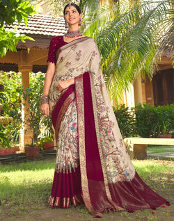 Beautiful sarees for a beautiful lady. Look the best in this Floral Print Cream Soft Dola Silk Saree.