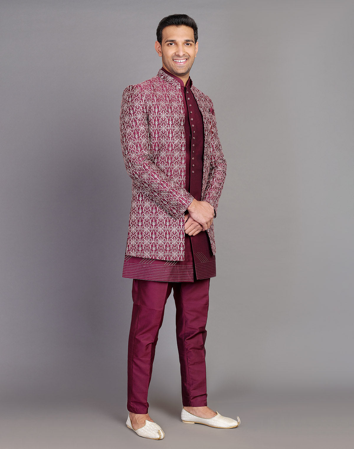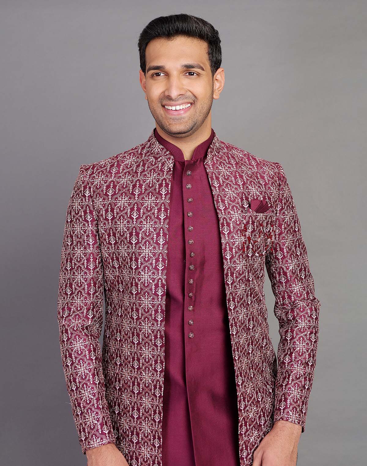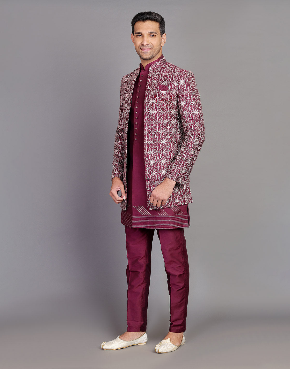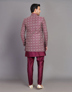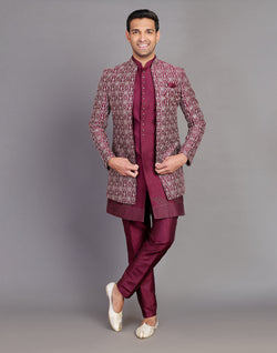 Raw Silk All Over Thread and Embroidery Indo Open Style features intricate threadwork with a subtle Floral pattern on raw silk fabric. It is enhanced with Embroidery for a touch of elegance and showcases an open-front design typical of traditional Indo-western fusion styles. This ensemble combines classic craftsmanship with modern flair for a sophisticated and versatile look.
