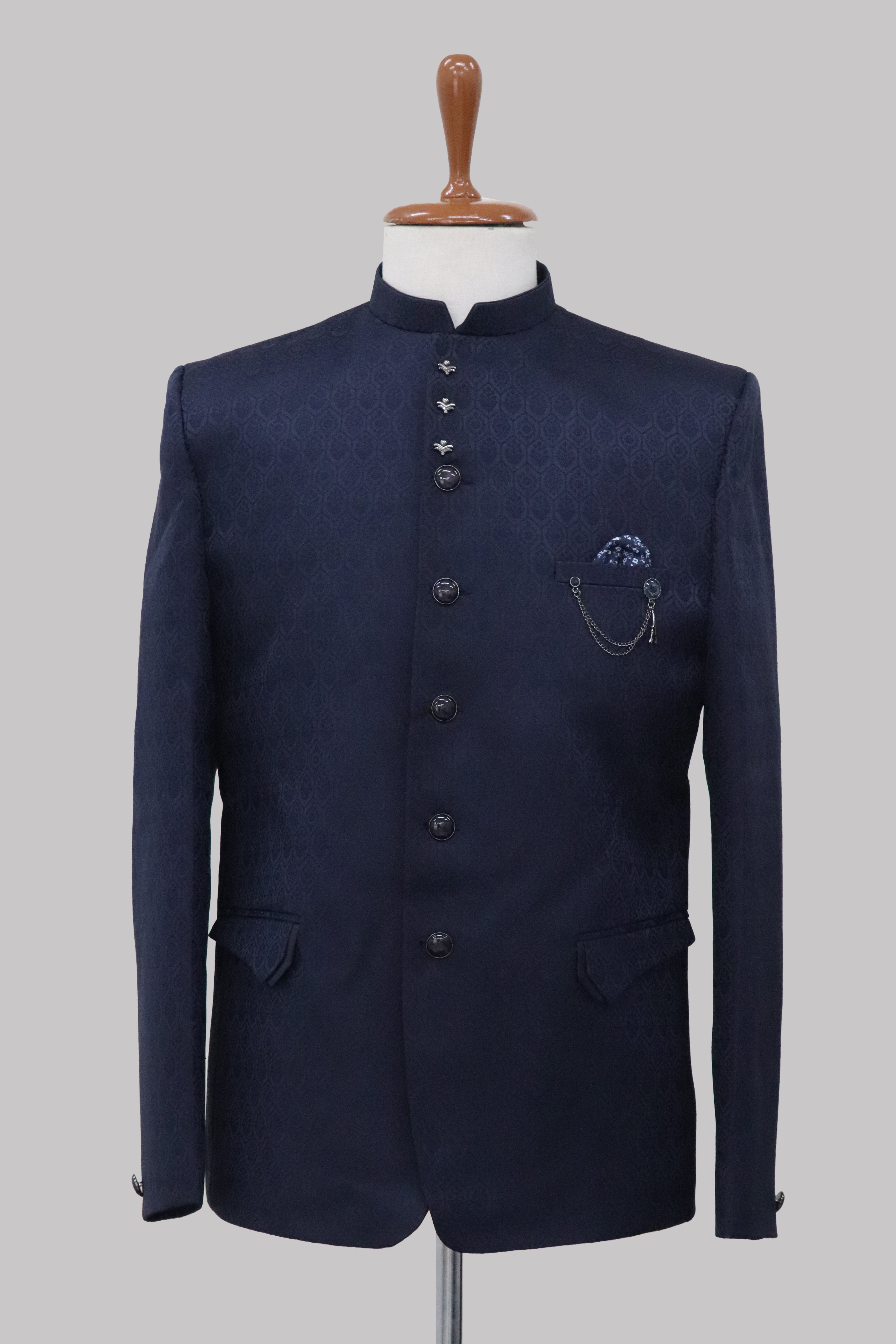 Traditional Blue Self-Weaved Jacquard Bandhgala Set features intricate jacquard weaving for a sophisticated, textured look. Paired with an unstitched polyester terry cotton pant, it offers both comfort and style. Ideal for formal occasions, this set combines traditional elegance with modern comfort.