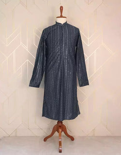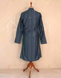 Look handsome and elegant in this Blue Striped Raw Silk Embellished Kurta Pyjama Set with pockets on both sides.