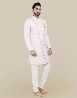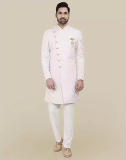 This Sherwani is a luxurious self jacquard, bottom-chudi pant all over self brocade. This luxurious garment is made of self jacquard fabric and features intricate brocade detailing all over. has a beautiful sheen to it. This Sherwani is perfect for weddings, parties, and other special occasions.