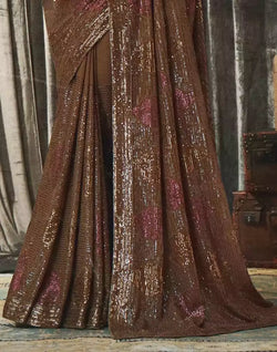 Drape this Brown Striped Sequence Semi Georgette Saree to look elegant and beautiful paired with a blouse piece that has embroidery on its sleeves.