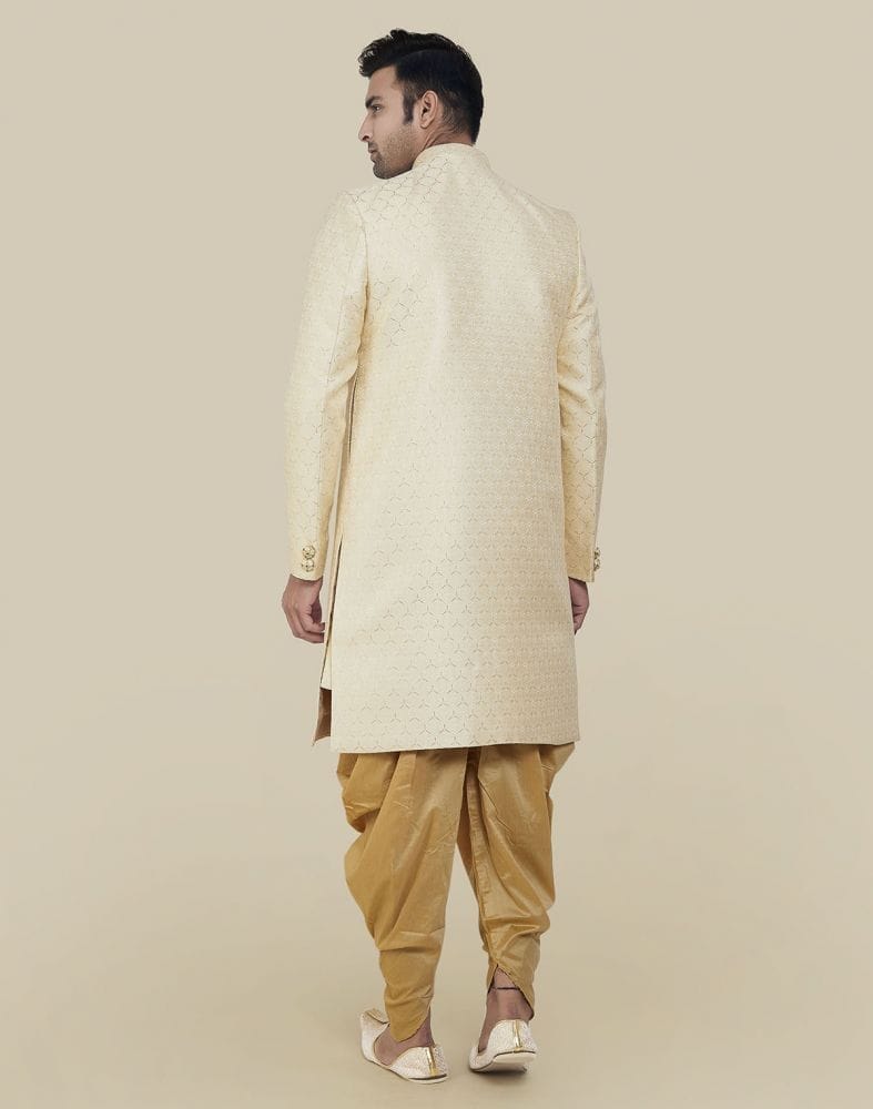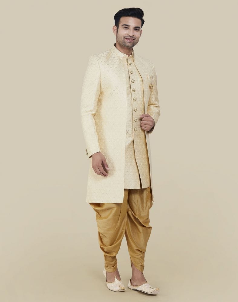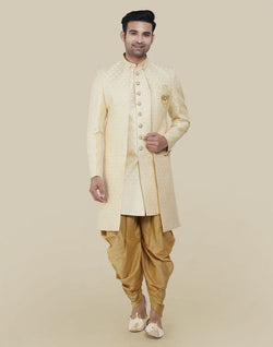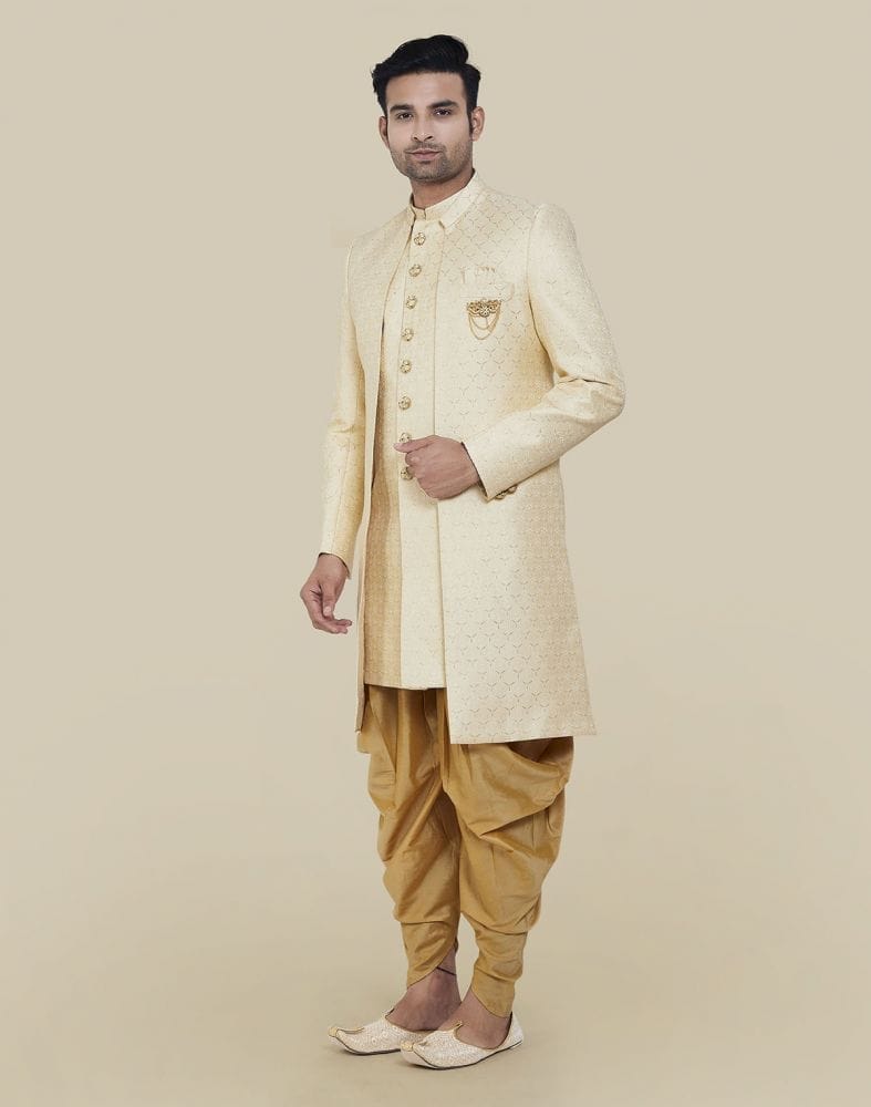 Stylish mens kurta-raw silk, bottom- silk embroidery with thread work on kurta is a luxurious and stylish choice for men. The raw silk material is of high quality and the embroidery work on the bottom of the kurta is simply beautiful. This kurta is perfect for special occasions or even as everyday wear. The kurta looks best when paired with matching bottoms and shoes.