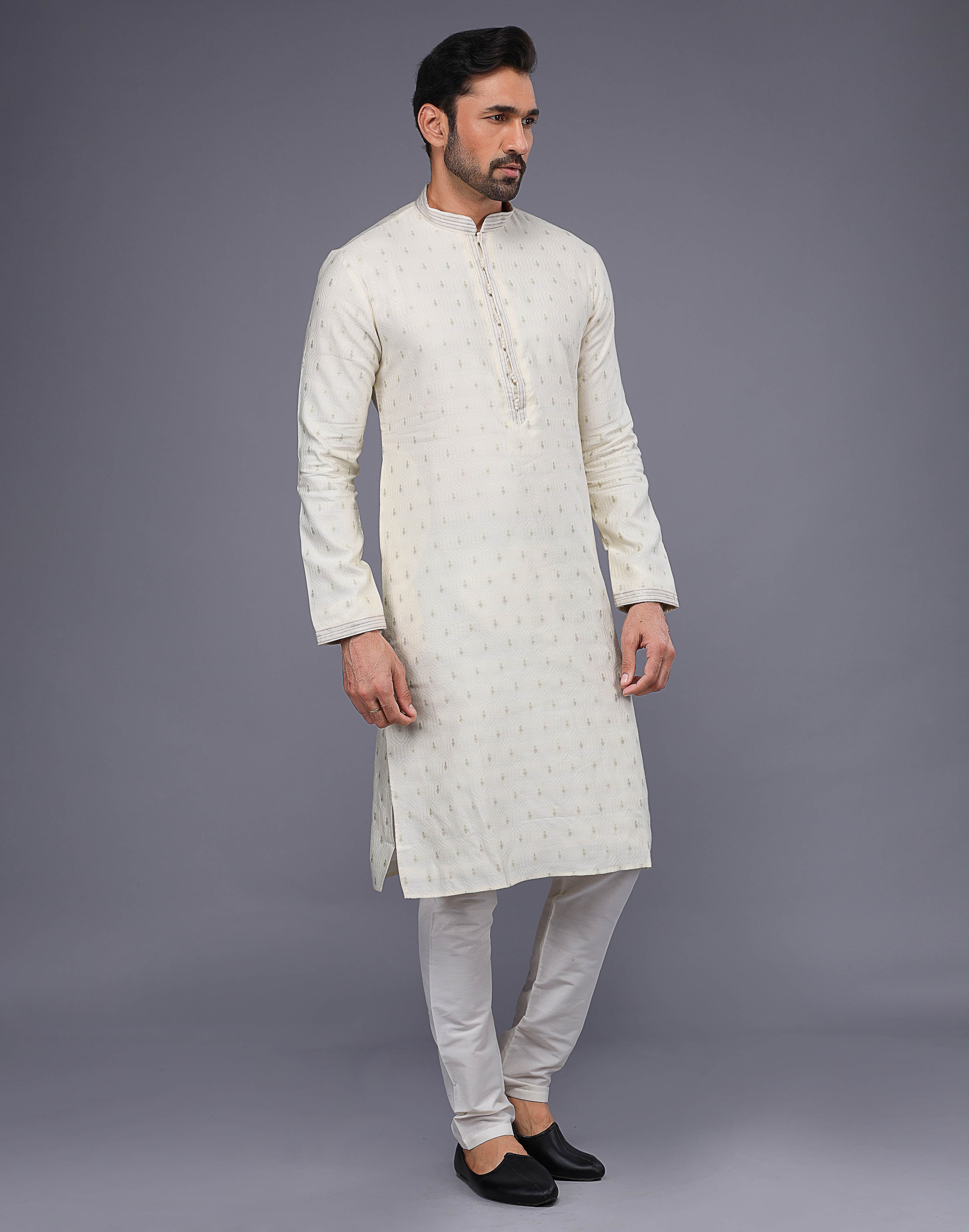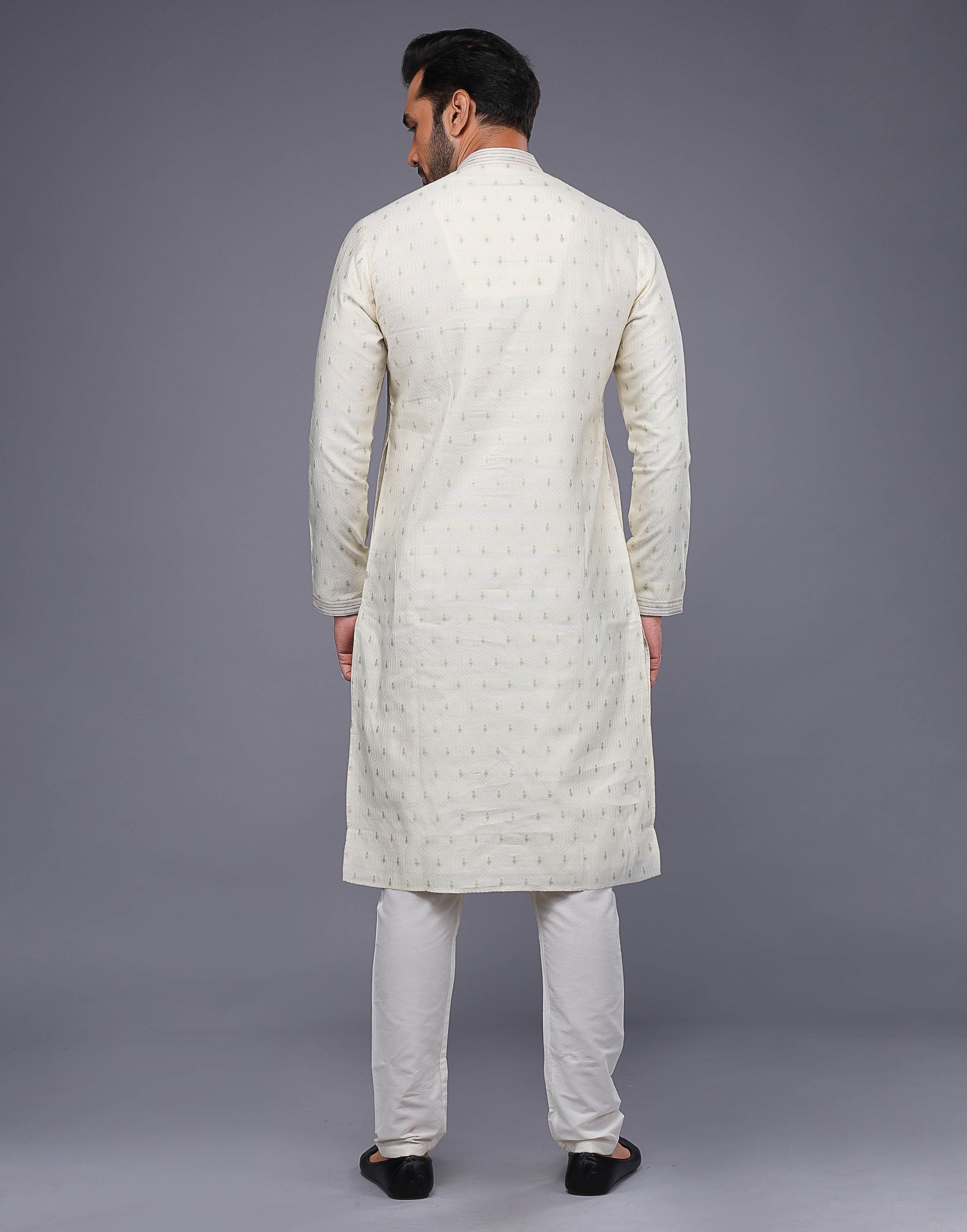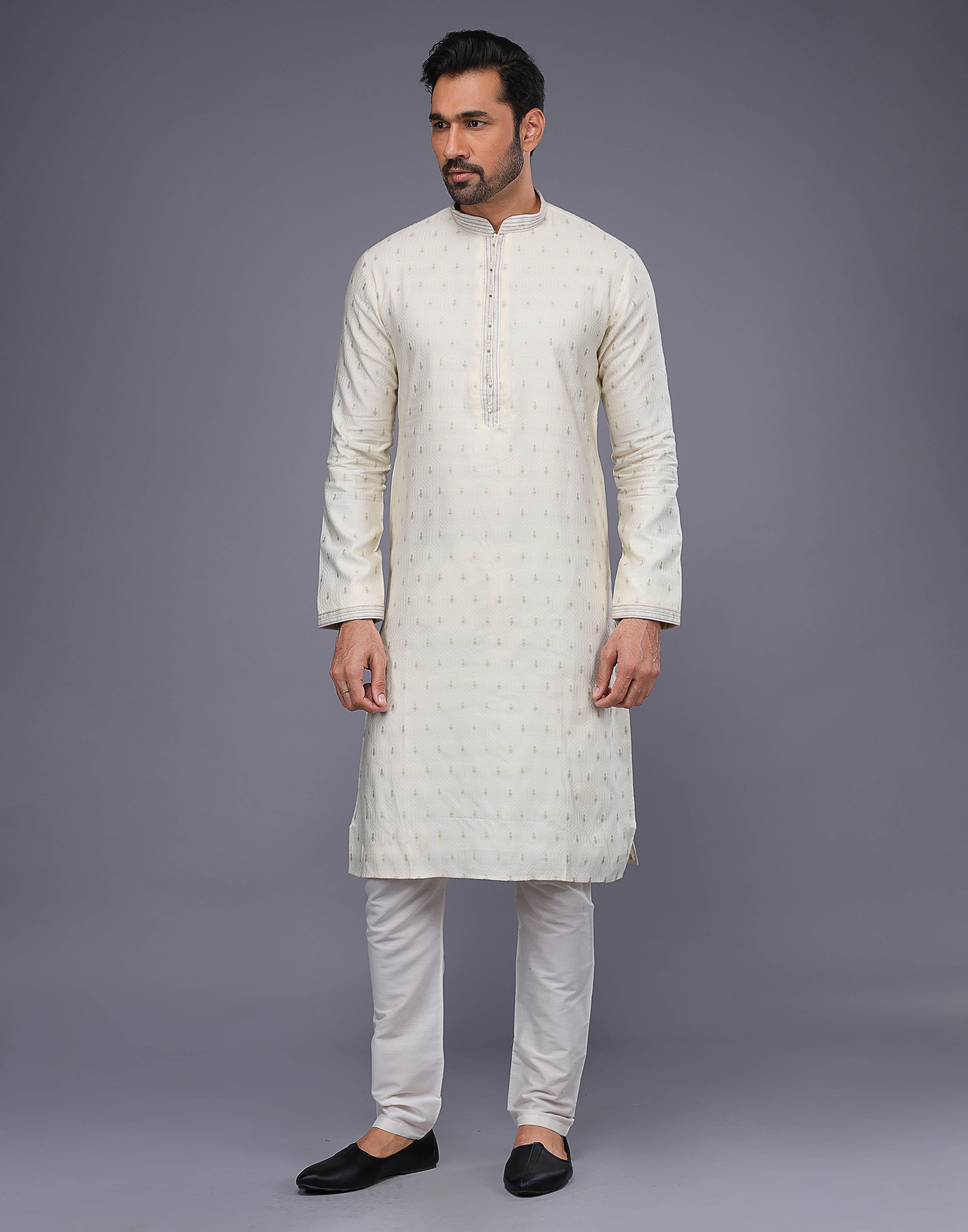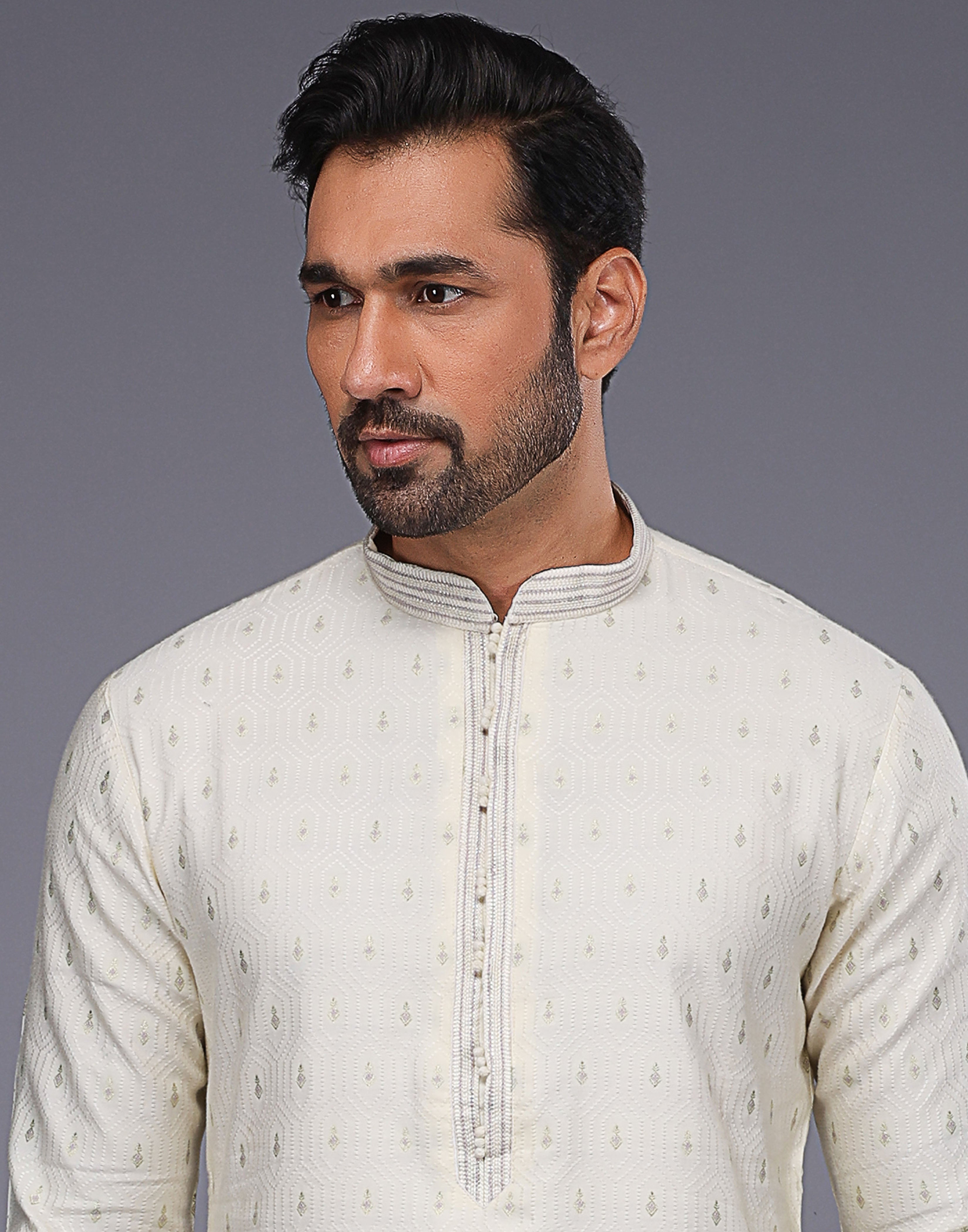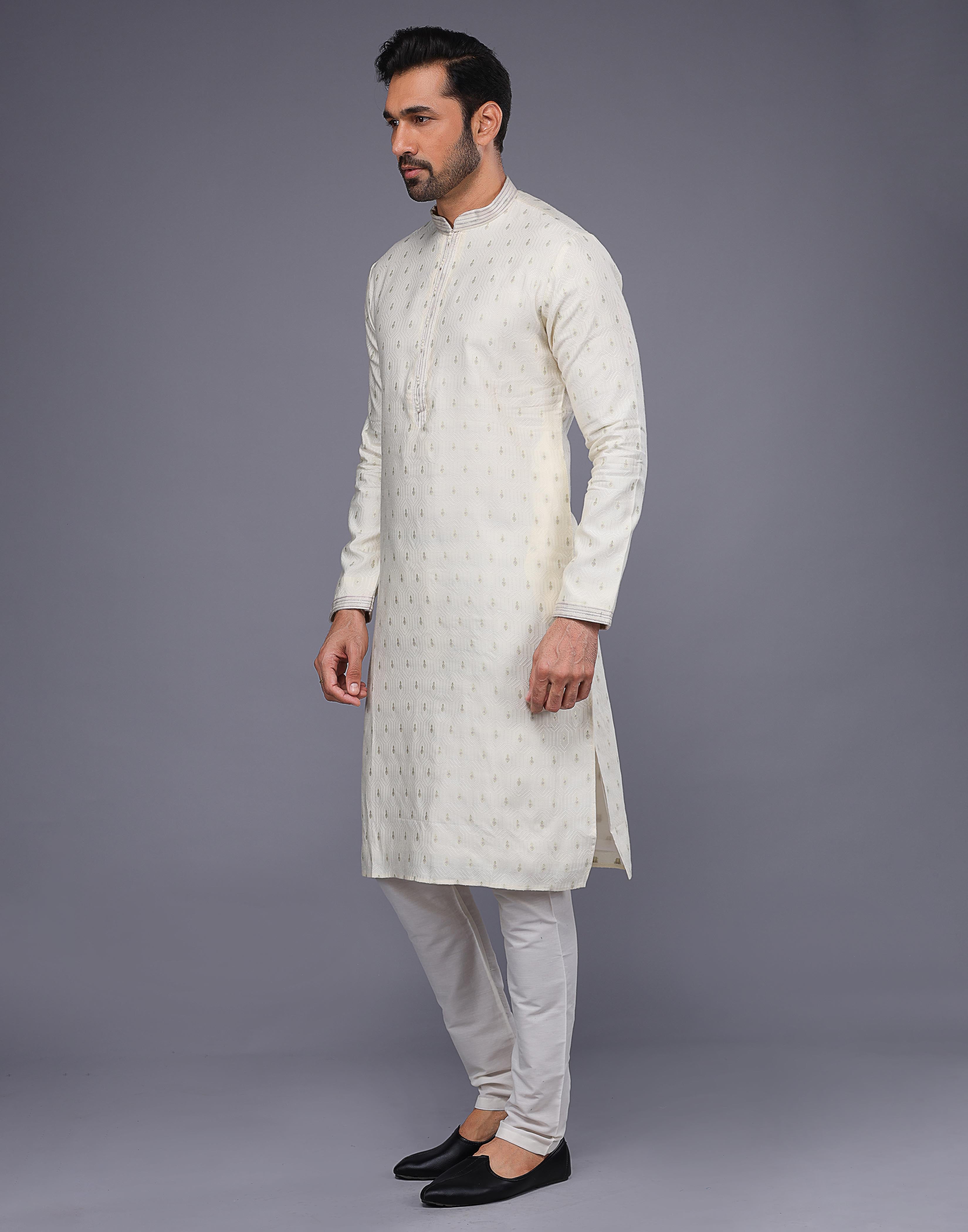 Looking for something special to wear to your next event? Why not try a dot printed kurta with texture? This luxurious style features a kurta made of jacquard fabric with intricate collar work. The bottom is a cotton thread and embroidered in a beautiful design. You'll love the way you look and feel in this one-of-a-kind outfit!