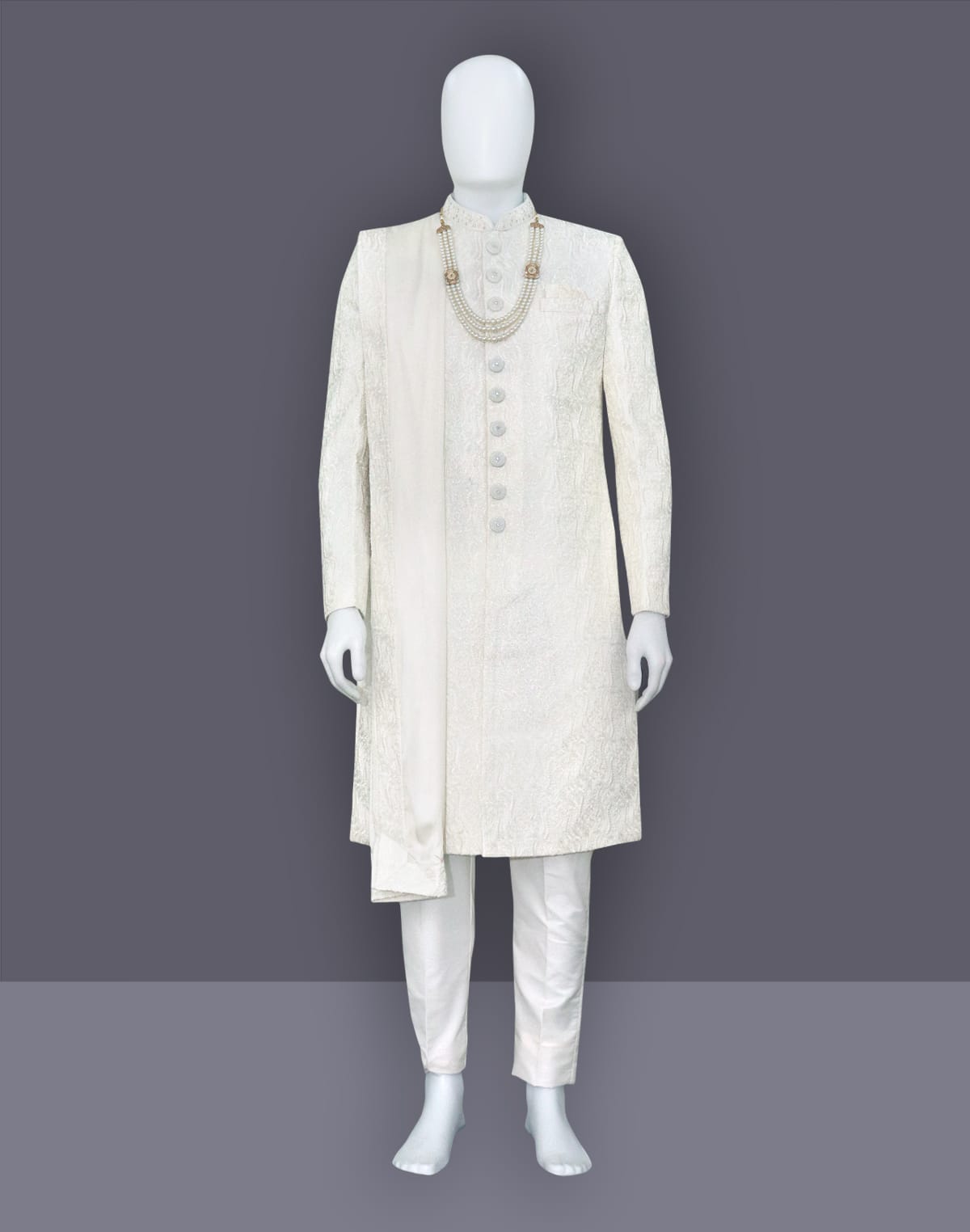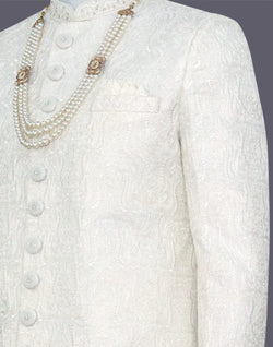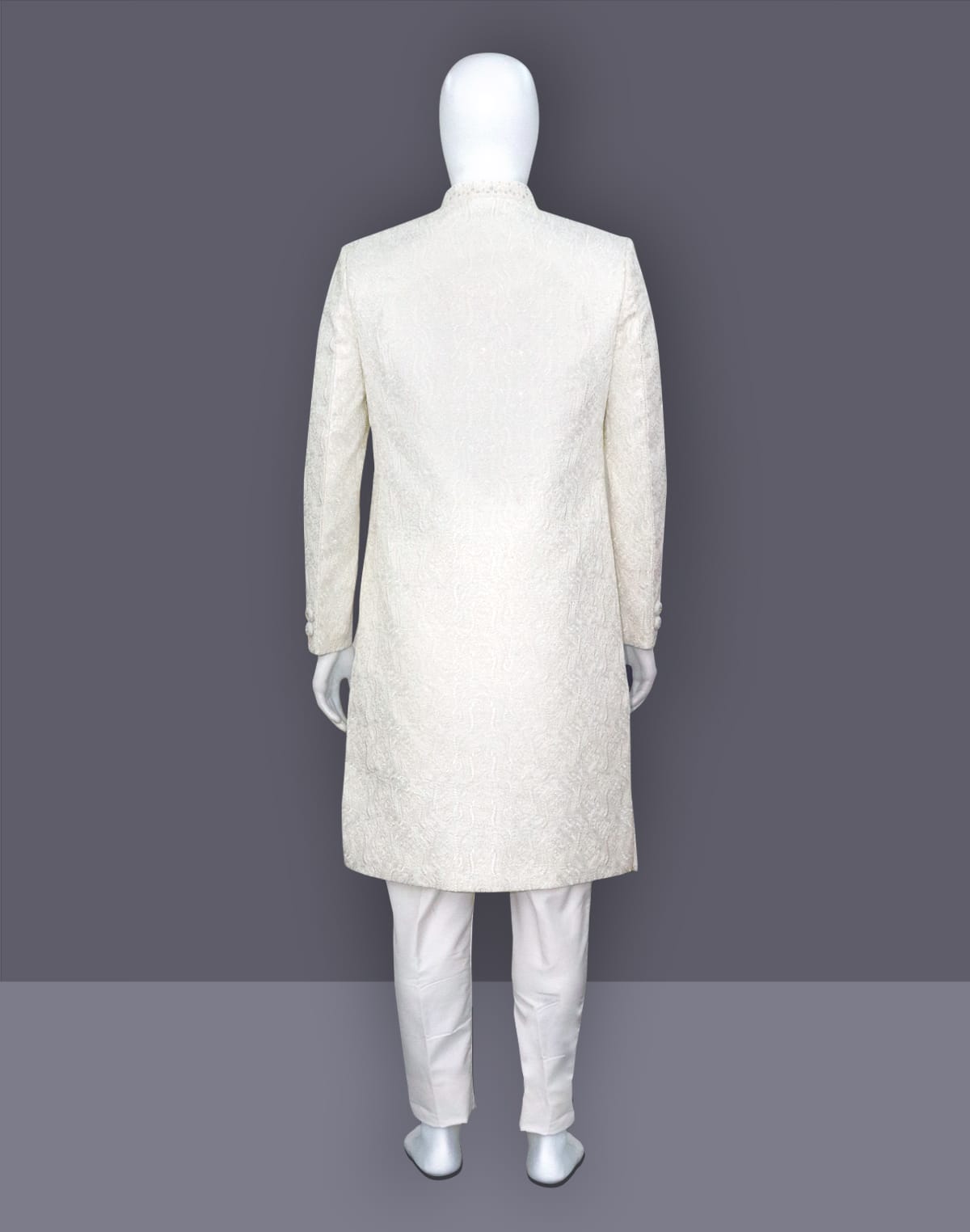 The Cream Indo Western paints a delightful canvas of ardor, fondness and Wow. The all over self embroidery with beautiful mala and pyjama, makes for the ultimate choice for the new-generation groom. This wedding season, try out this ethereal outfit complete with a matching dupatta and impress all with your elevated style and personality.