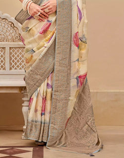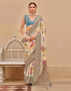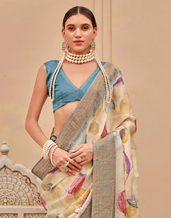 Get ready to turn heads in this Cream Graphic Print Art Silk Saree. The intricate copper zari border adds a touch of glamour to this traditional piece, while the light blue blouse offers a contemporary twist. Look effortlessly stylish and feel comfortable all day long in this lightweight saree.