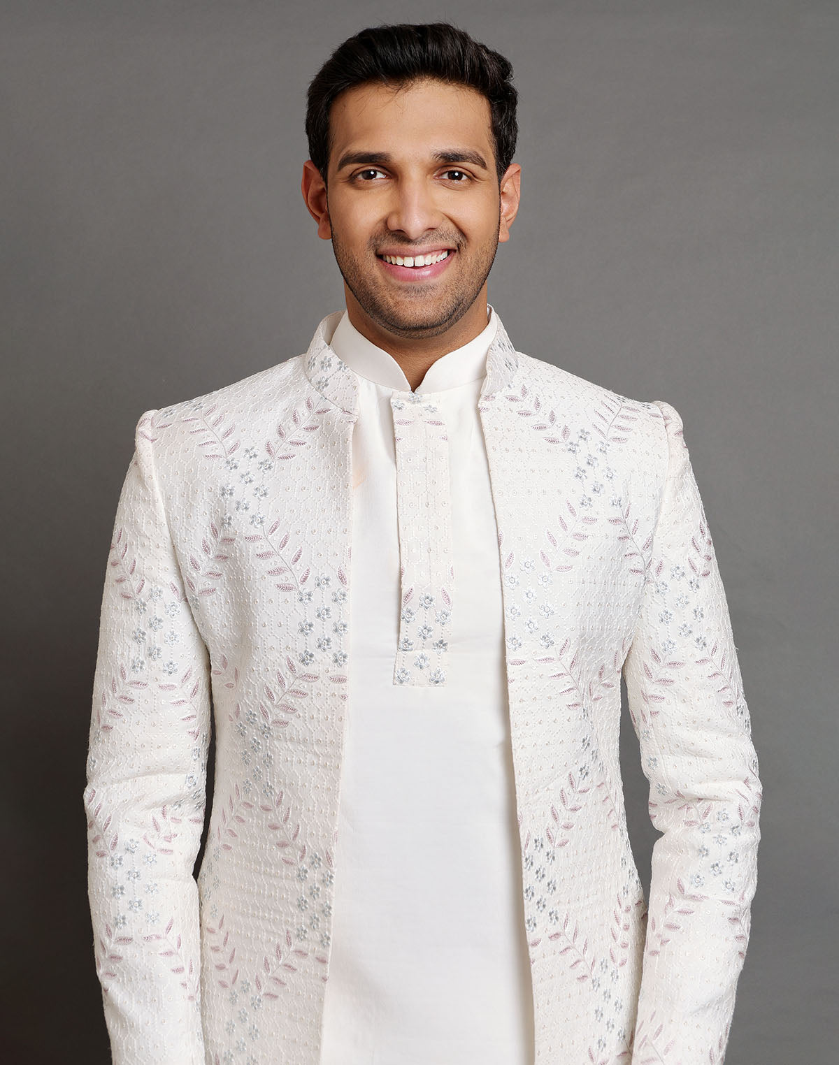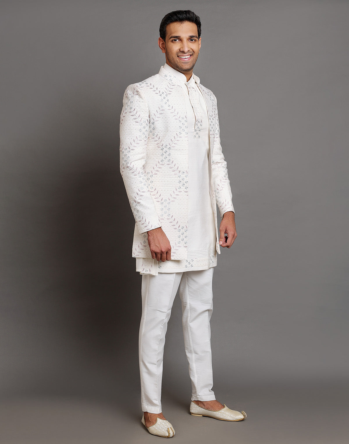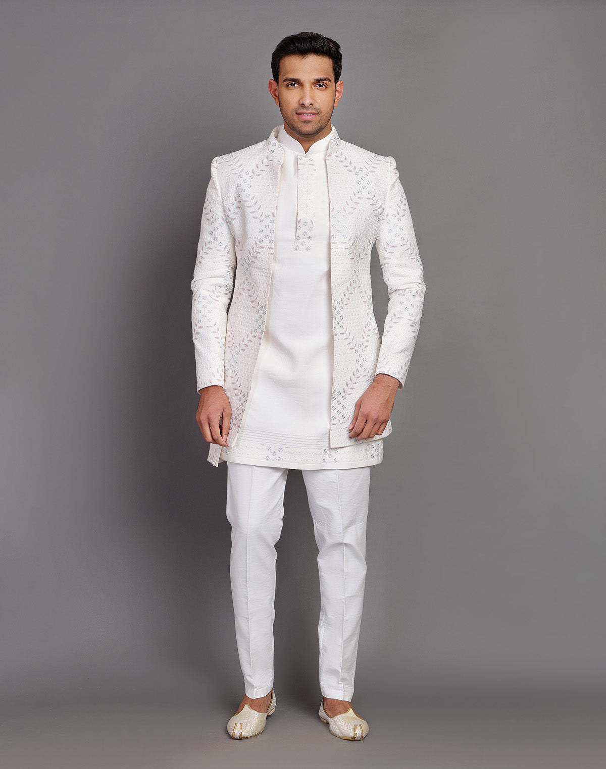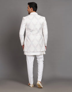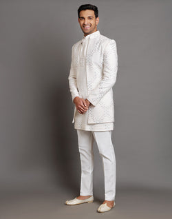 All Over Premium Thread Embroidery Design Indo-Western Set is crafted from luxurious raw silk, featuring intricate thread embroidery across the fabric. The set includes a stylish Indo-Western top with delicate floral or geometric motifs, adding sophistication to the attire. Paired with a matching raw silk dupatta, the ensemble radiates elegance and charm. The outfit is complemented by a comfortable cotton pyjama bottom, offering both style and ease. Perfect for festive occasions or formal gatherings, this set combines traditional craftsmanship with contemporary flair.