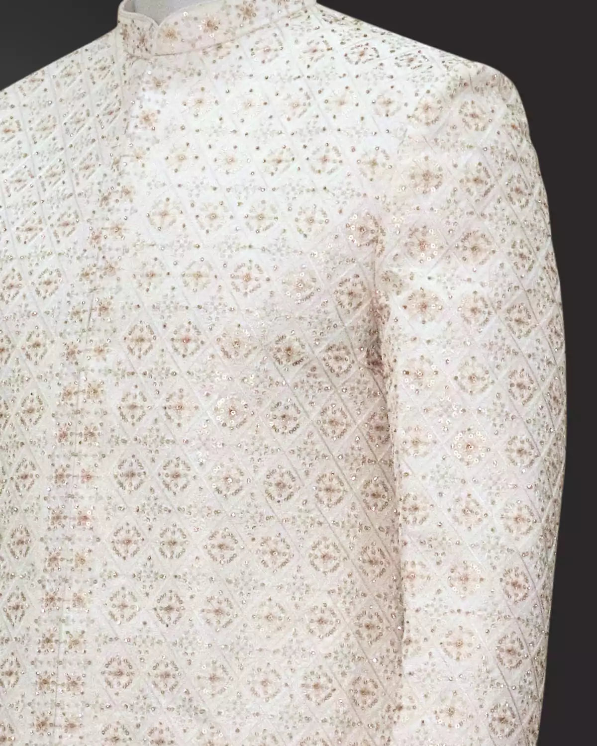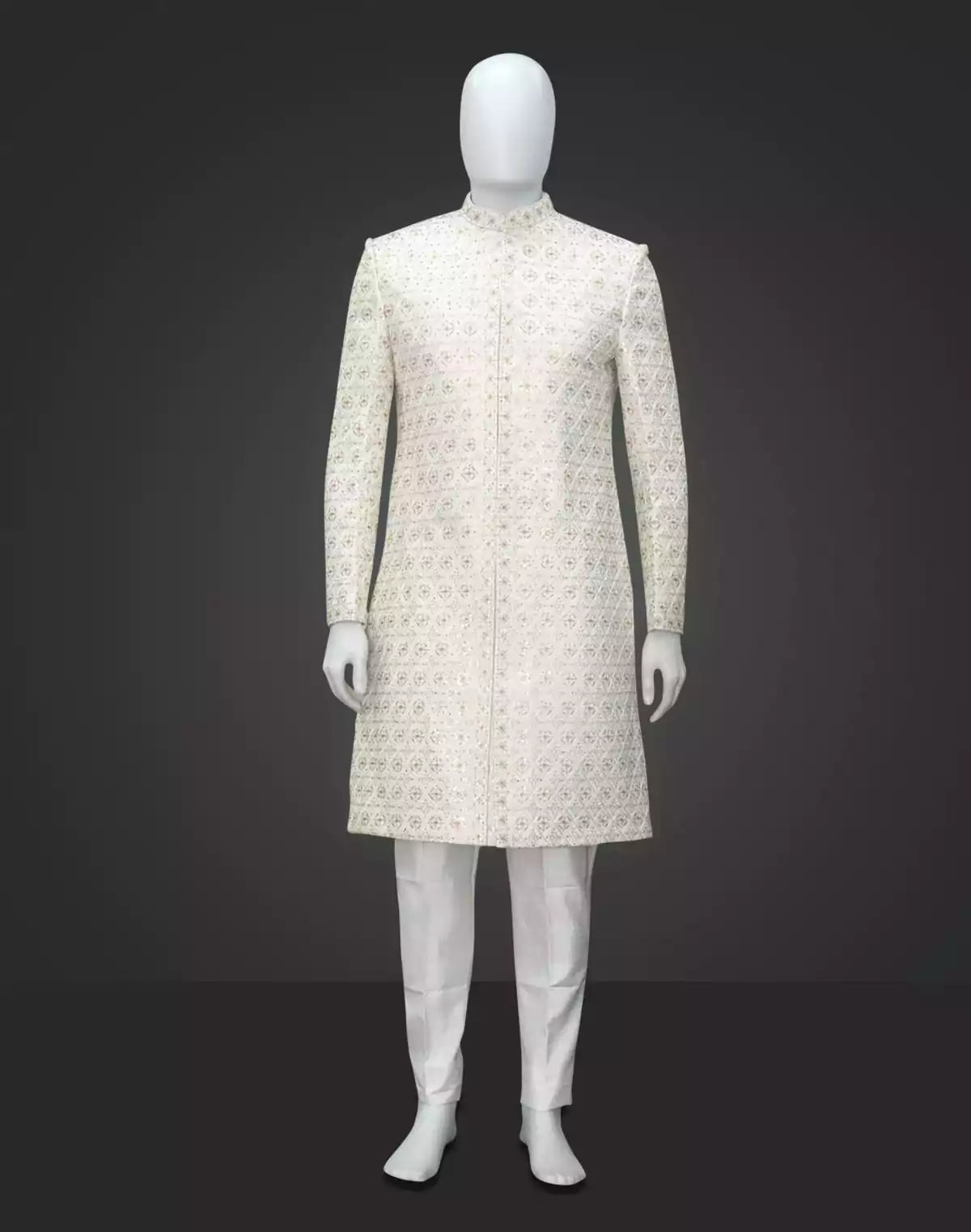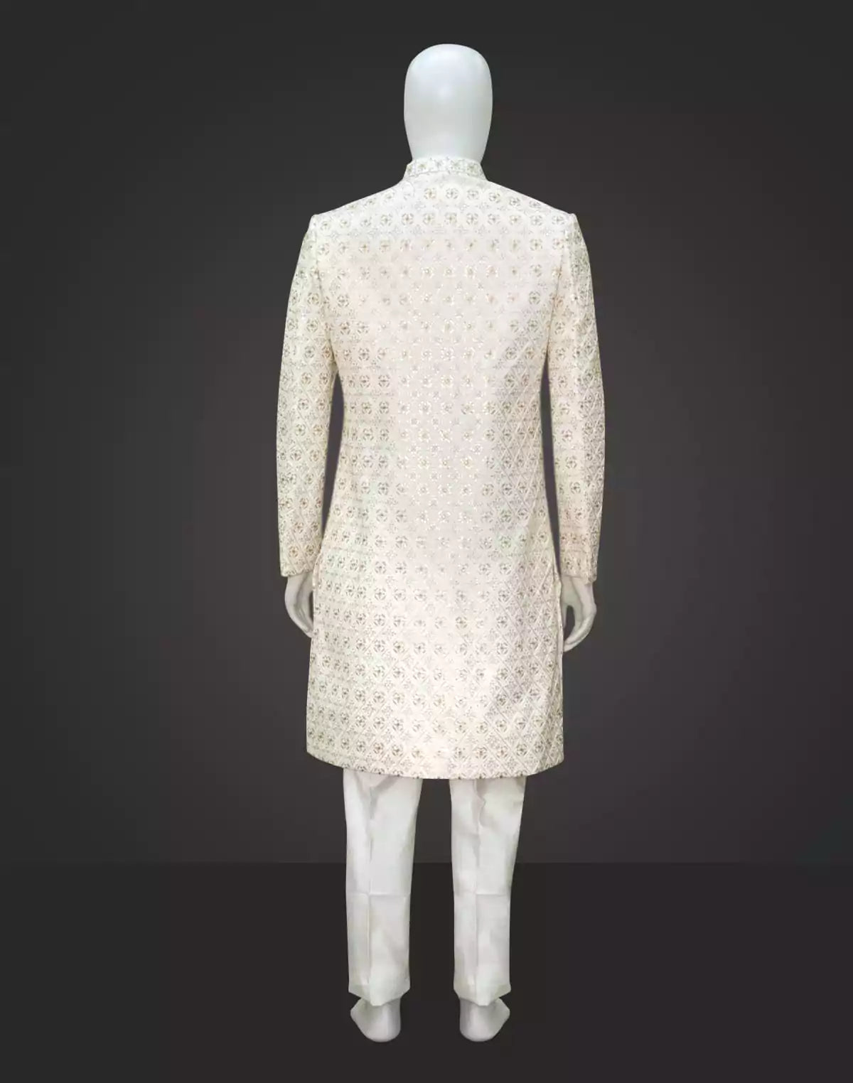 Look effortlessly elegant in this Cream Sequins embroidered Georgette Indo Western set. The intricate embroidery work adds a touch of glamour, making it perfect for weddings and special occasions. Pair it with the cream pyjama for a complete and sophisticated look.