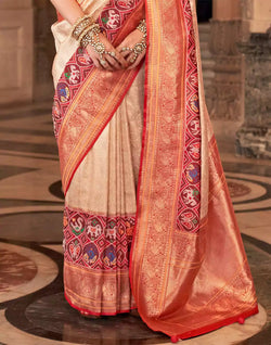 This saree is meticulously handwoven in Banaras, a city renowned for its rich silk weaving heritage. The primary material of the saree is luxurious silk, known for its smooth texture and natural sheen. The zari work typically features elaborate patterns, including floral motifs, paisleys, and geometric designs, creating a stunning visual impact. One of the standout features of this saree is the Meenakari work. Meenakari is the art of enameling, where vibrant and colorful designs are hand-painted or enameled onto the fabric. The saree is typically accompanied by a matching blouse piece, allowing for a complete and coordinated look.