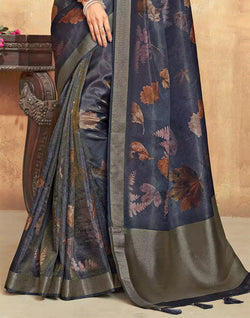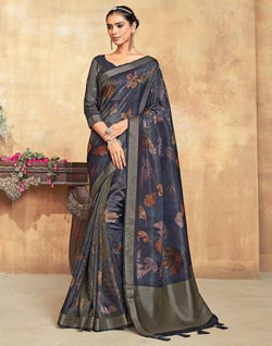 Look perfect in this dark grey saree with all over beautiful botanical bunches and short pallu with beautified tussels and paired with dary grey blouse piece.