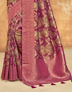 Attract and astound in this dark pink organza saree featured in geometric butta with golden zari floral motifs border with golden short pallu beautified tussels, comes with dark pink butta unstitched blouse piece. This ethnic saree for women merges timeless patterns with modern fabrics, it can be worn on casual day out, social gatherings to move in ease.