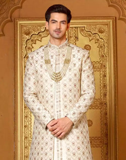Feel the elegance in this royal and smooth finish Dashing Cream Coloured Raw Silk Mirror work Indo-Western Set.