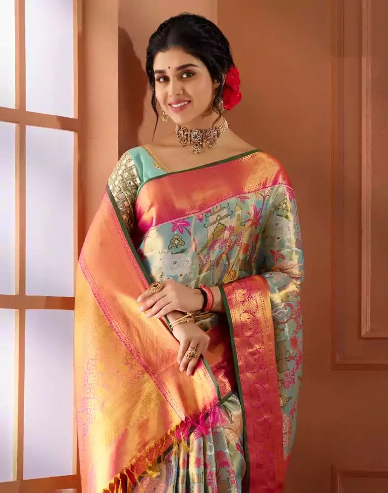 Feel the resplendence of a scintillating aqua blue hue marked gorgeously on this Double shaded Aqua Blue Pure Silk Saree. Note: The Blouse worn by the model is only for photo purposes but the actual colour of the blouse is same light blue colour.