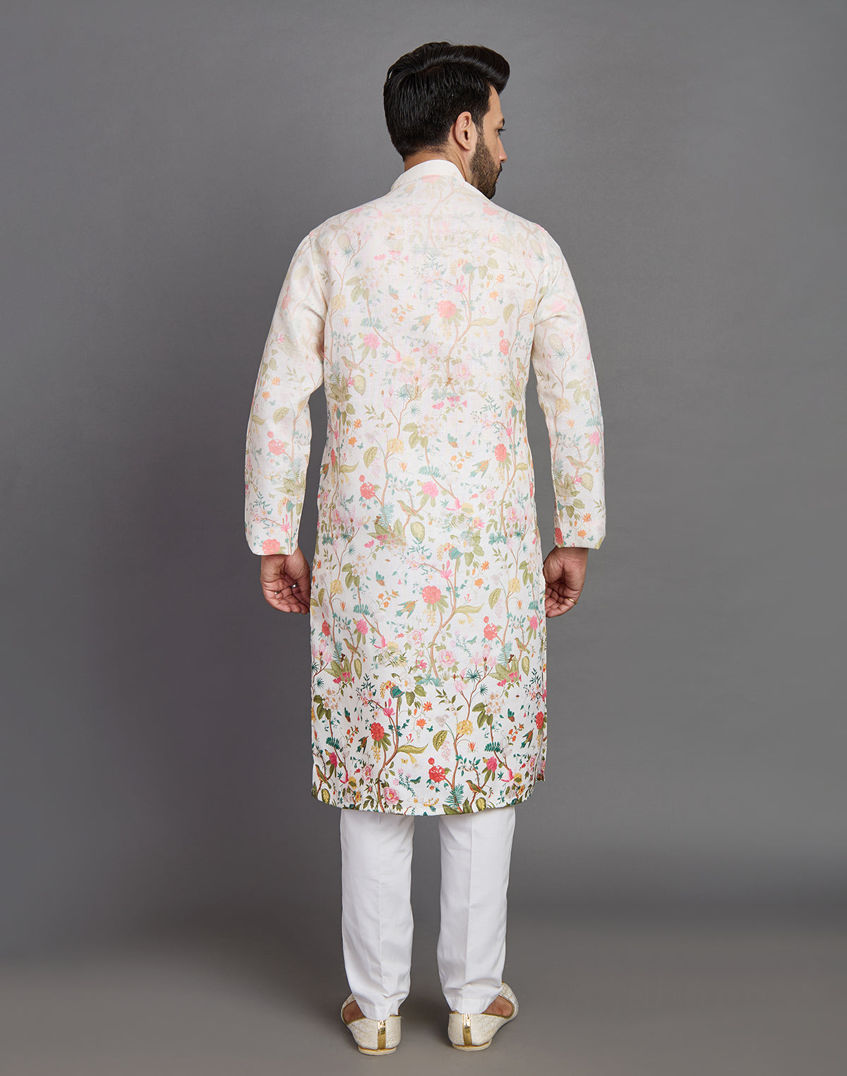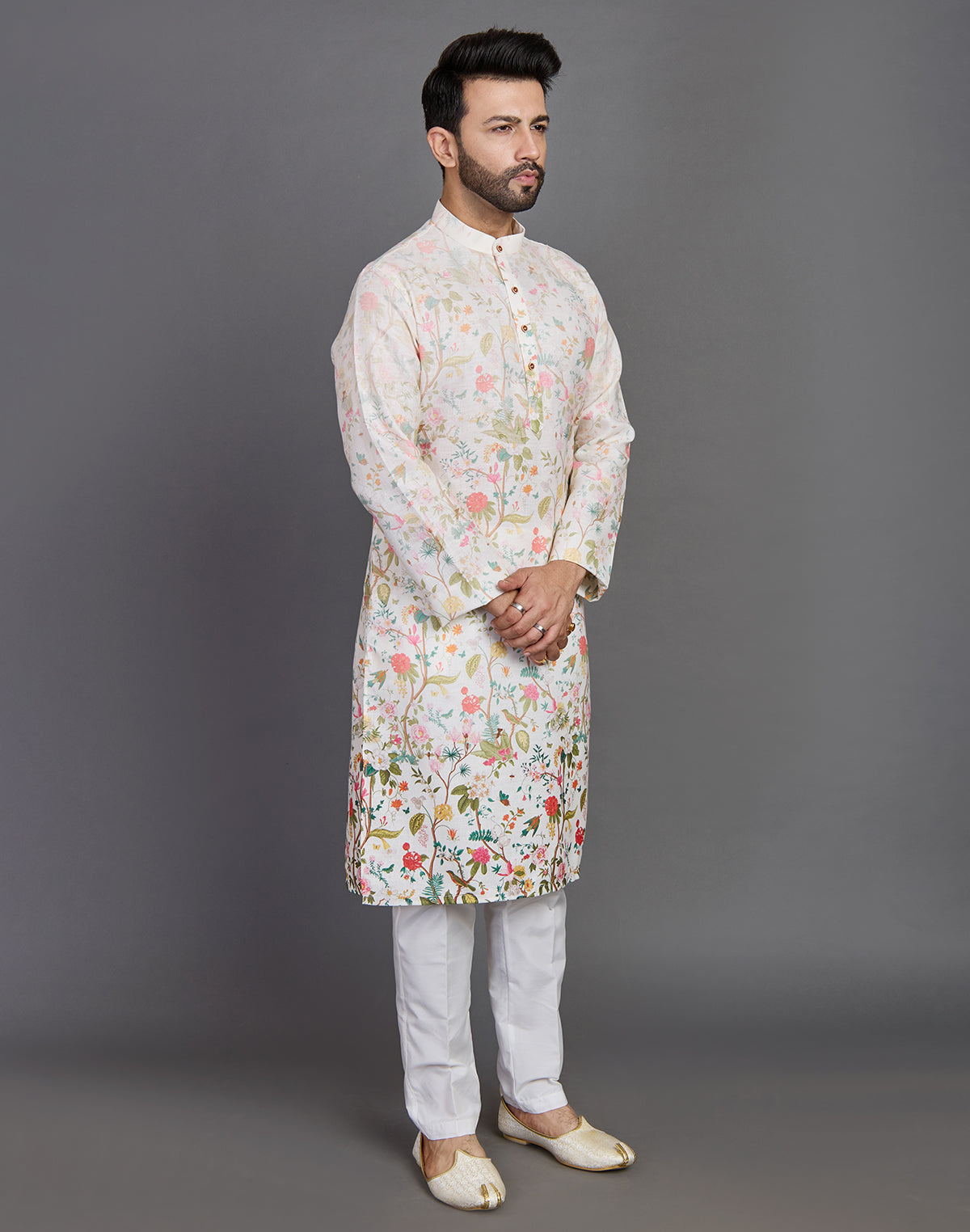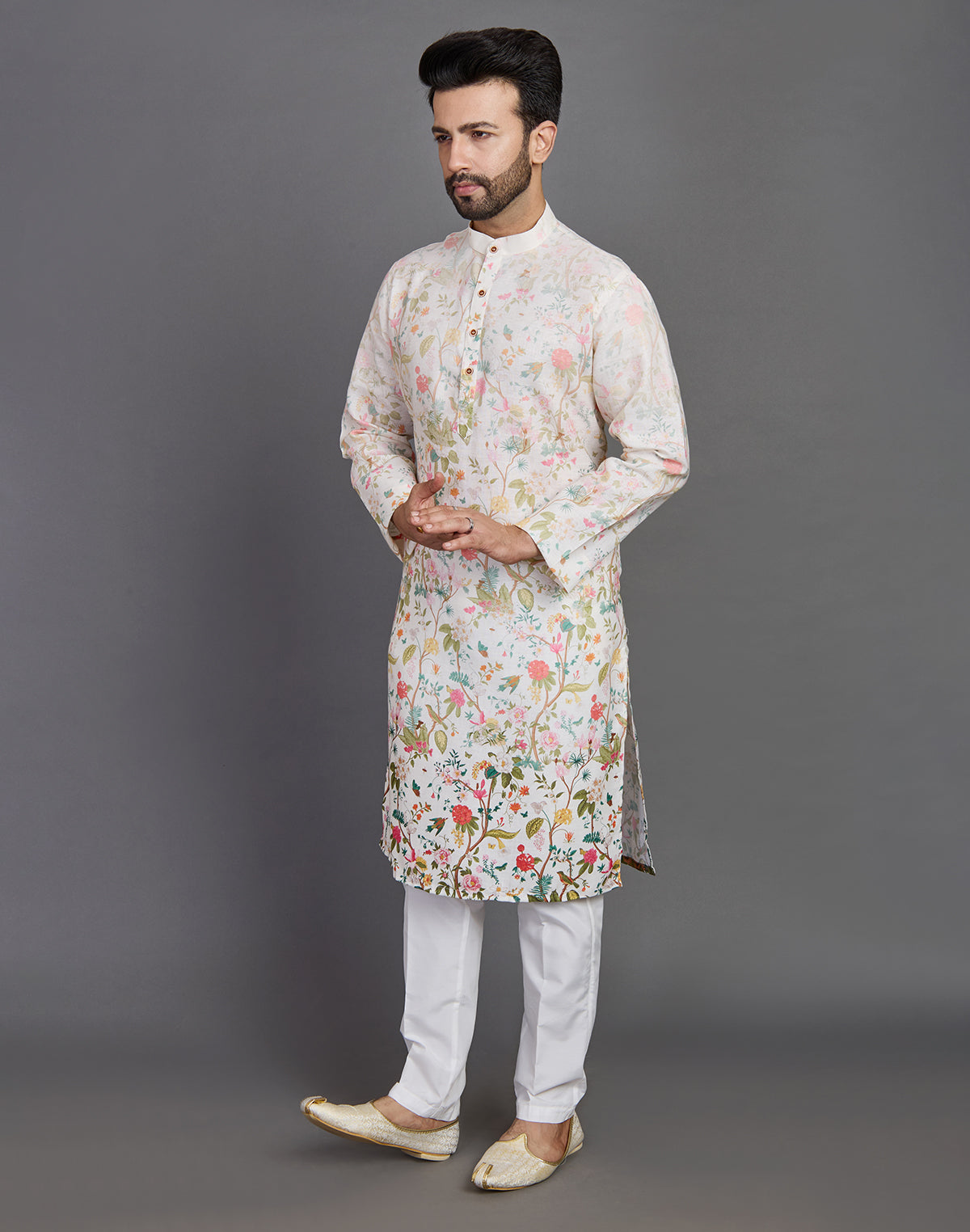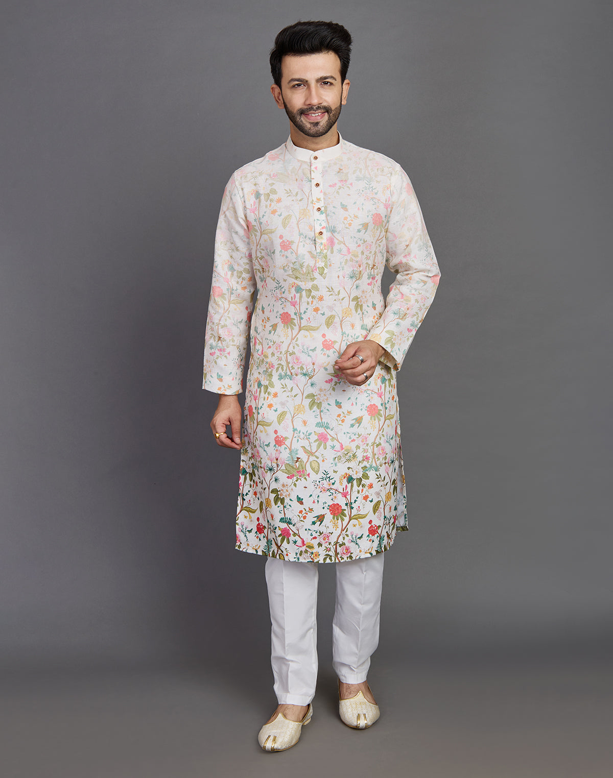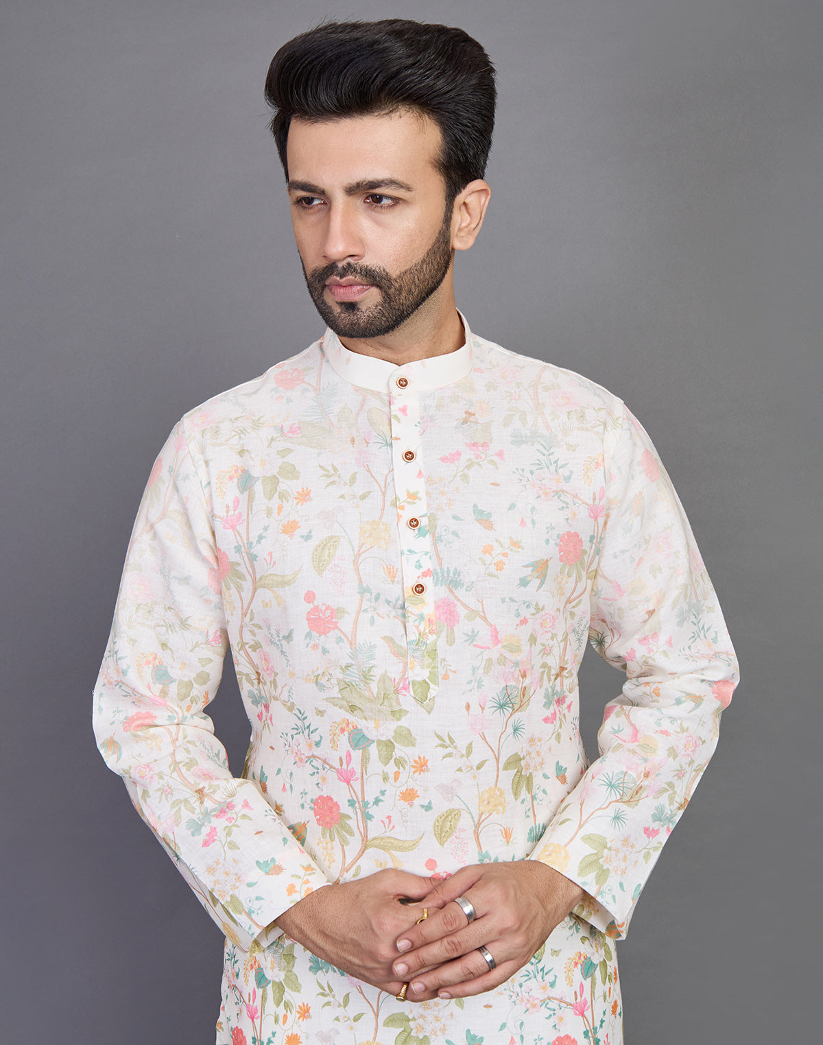 This elegant cream-colored cotton kurta features an all-over floral print, offering a timeless blend of style and comfort. The soft fabric ensures breathability, while the delicate floral design adds a touch of sophistication. Perfect for any occasion, this kurta combines traditional charm with modern appeal.