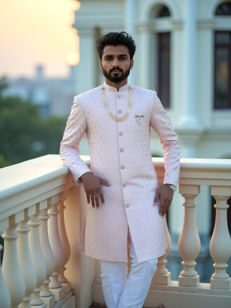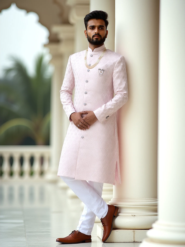 In peach semi-Indo features a luxurious all-over self-patterned jacquard design, adding a sophisticated touch to any occasion. The rich fabric offers a perfect blend of traditional charm and modern style. Ideal for those seeking a refined, graceful look with intricate detailing.