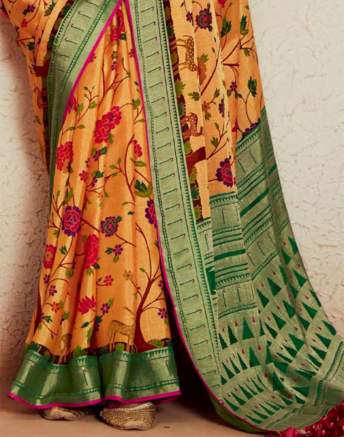 This beautiful Floral Design Soft Brasso Silk Saree in Light Orange with embroidered work blouse piece is the epitome of elegance, perfect for festivals and special occasions.