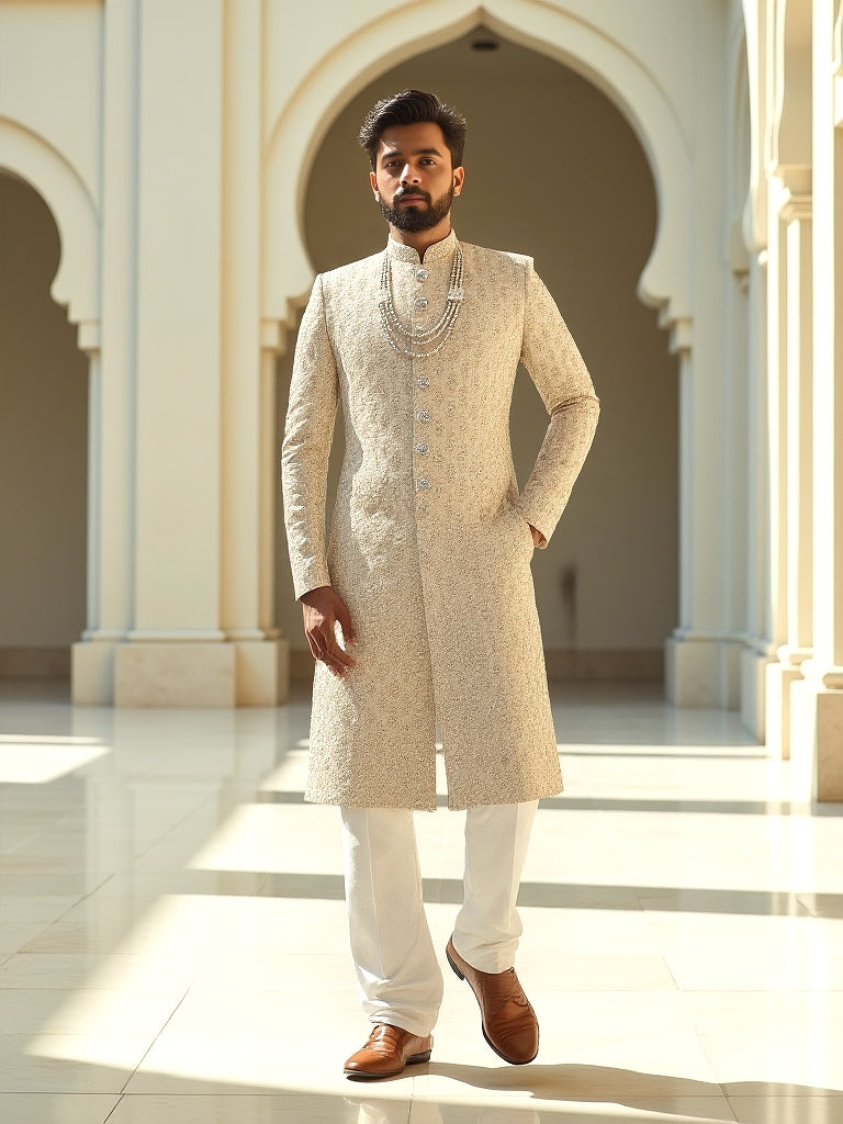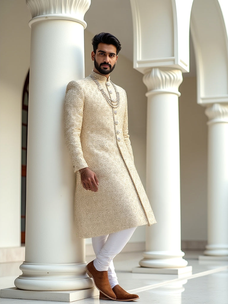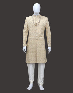 In Gold All Over Rich Zardosi Sherwani is crafted from luxurious Tussar fabric, featuring intricate stonework that adds a touch of regal elegance. The detailed Zardosi embroidery, done in golden thread, covers the entire sherwani, creating a stunning visual effect. Paired with a three-line mala, the ensemble enhances its grandeur, perfect for a royal or festive occasion. The combination of traditional craftsmanship and modern opulence makes this sherwani a truly remarkable choice for a groom or celebrant.