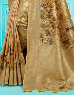 Elevate your ethnic wardrobe with Floral, a luxurious Gold Organza saree that exudes elegance and style. The intricate zari weaving and digital prints add a touch of sophistication to any occasion. Make a statement confidently in this stunning piece that is sure to turn heads wherever you go.