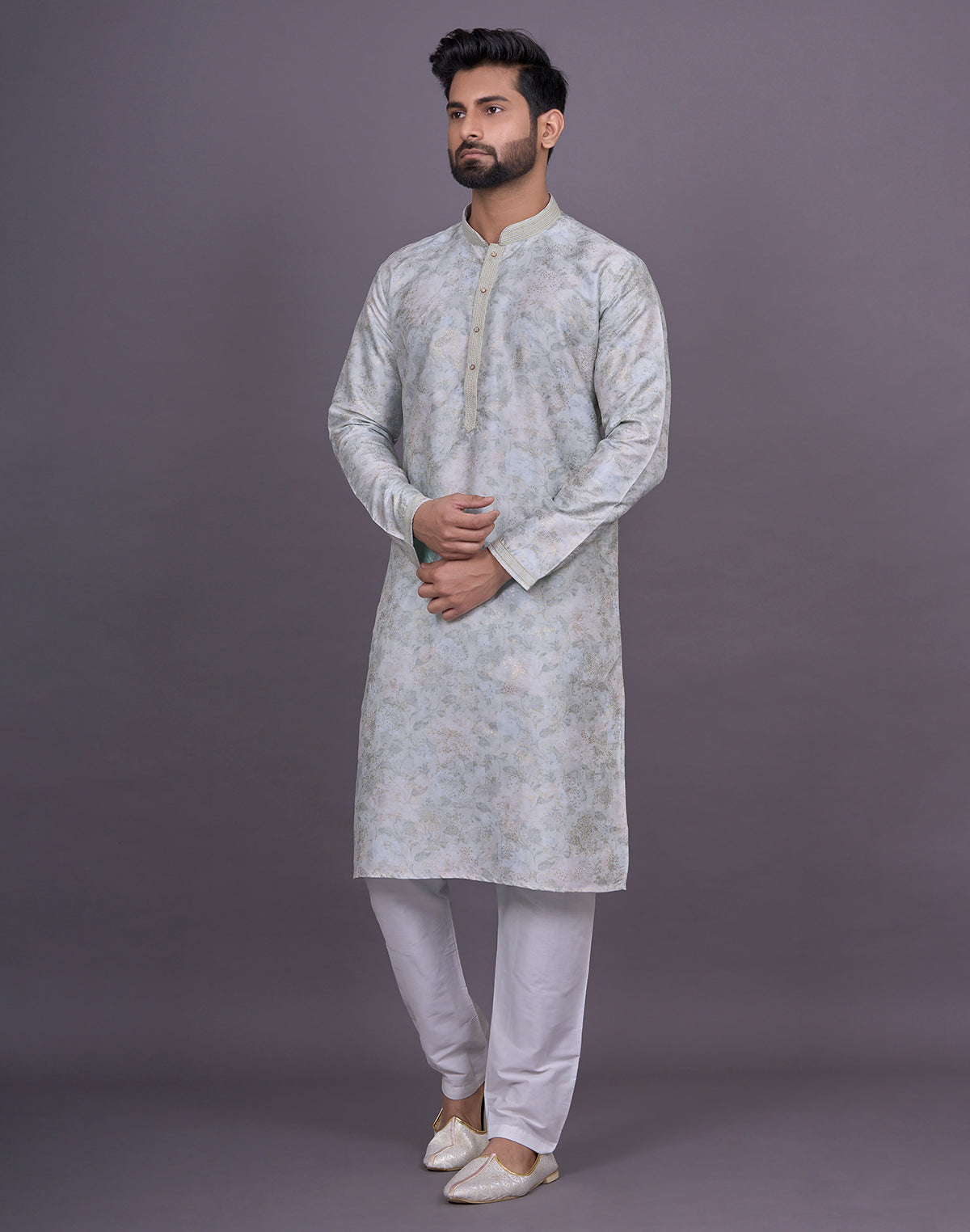 Wrap yourself in elegance with the Graceful floral design Raw Silk Kurta Pyjama Set. Crafted from lightweight raw silk fabric, this set is perfect for any special occasion where you want to stand out. The intricate golden butta details add a touch of sophistication to your ensemble.