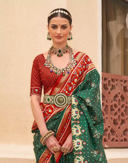 Indulge in the timeless allure of our Green Designer Woven Palkhi Patola Silk Saree. This masterpiece exudes elegance with its intricate patterns and vibrant hues, making it a cherished addition to any discerning wardrobe. Embrace the artistry of Indian textiles with this exquisite ensemble, where every drape is a celebration of tradition and sophistication.