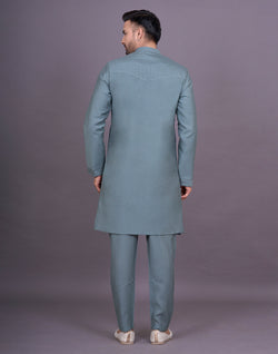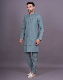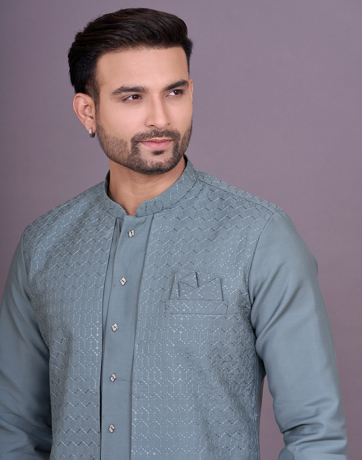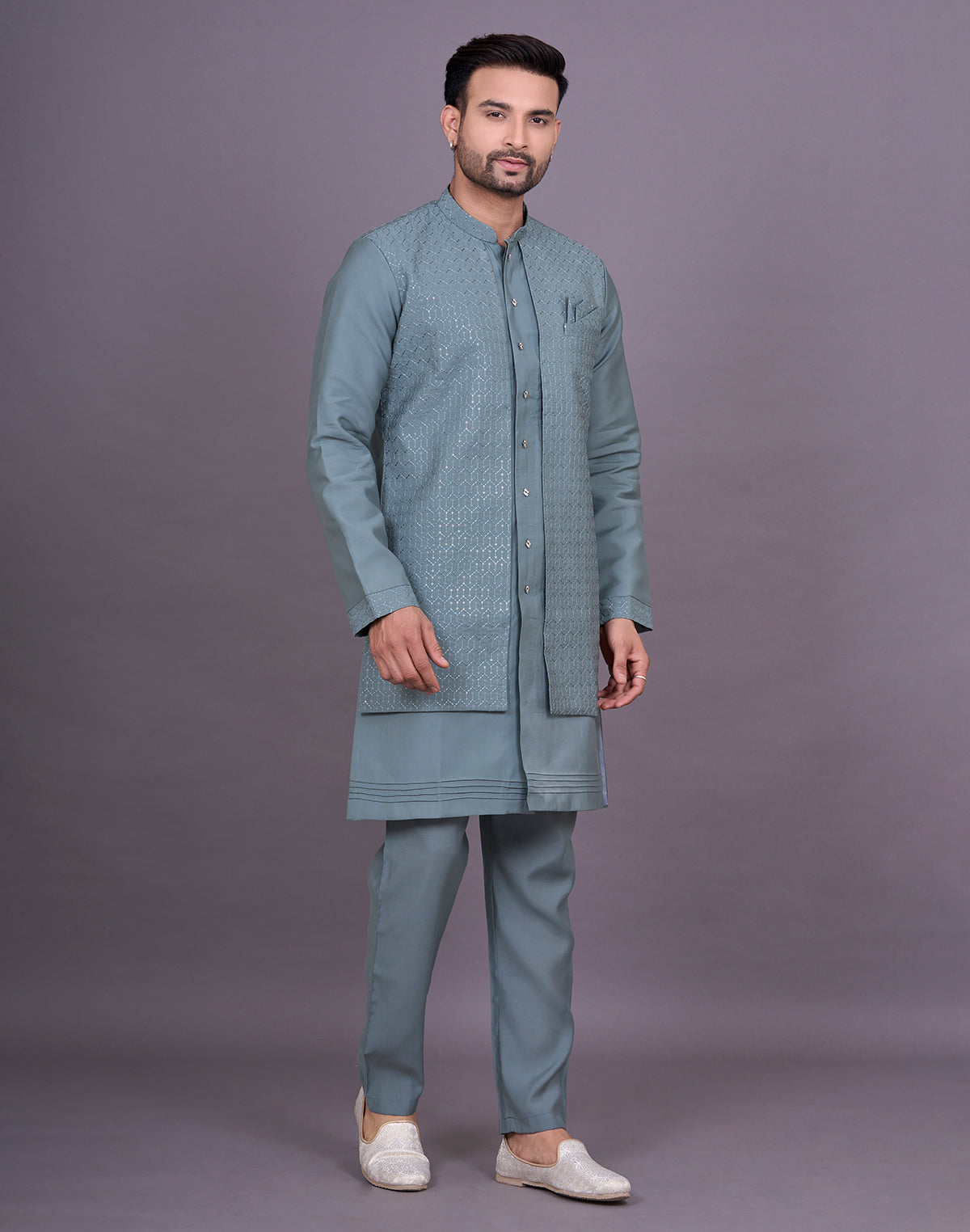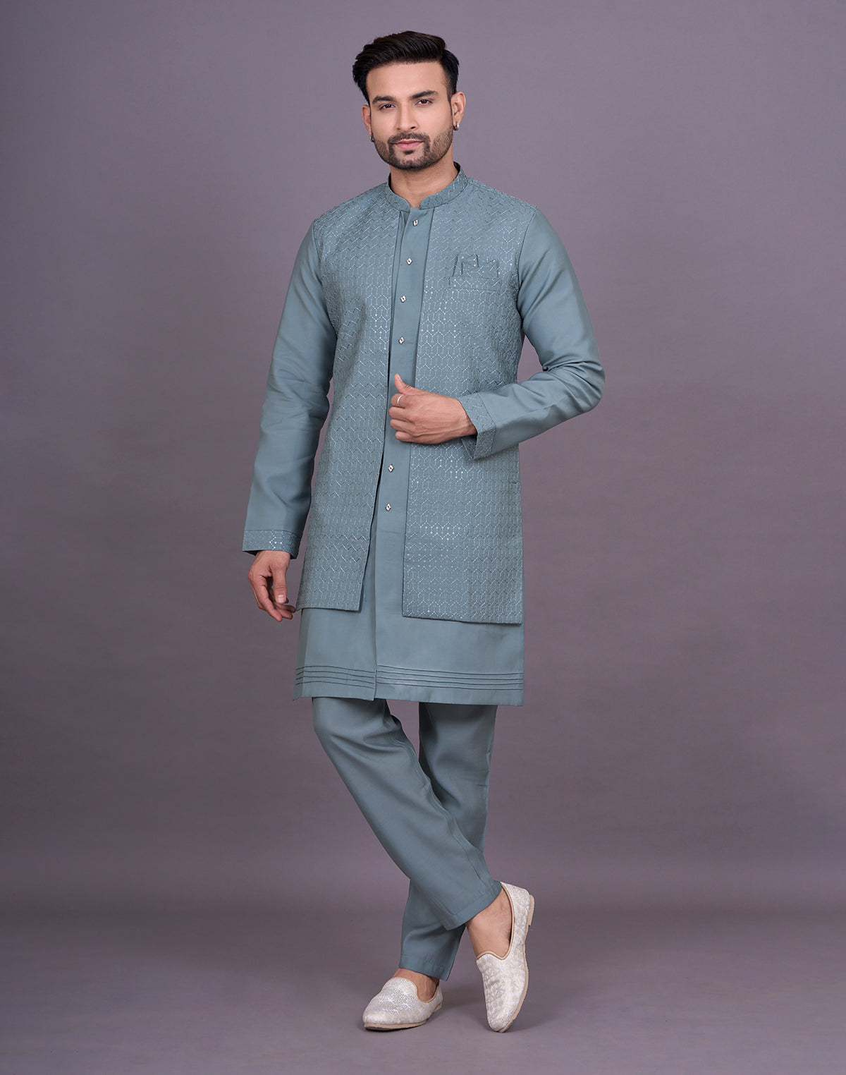 Looking for something special to wear to your next festival or occasion? Check out this stunning three-piece kurta jacket suit! The Kurta is made of self Jacquard fabric with a shiny finish, and features intricate embroidery work. The jacket is also adorned with beautiful embroidery, and has a flattering silhouette that will accentuate your figure. The pants are tailored to perfection, and complete the look with a touch of elegance. Whether you're attending a wedding or simply want to look your best, this suit is sure to make you stand out from the crowd.