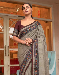 Simple yet fashionable Grey and Maroon Jute Silk Saree suitable for any small occassions.