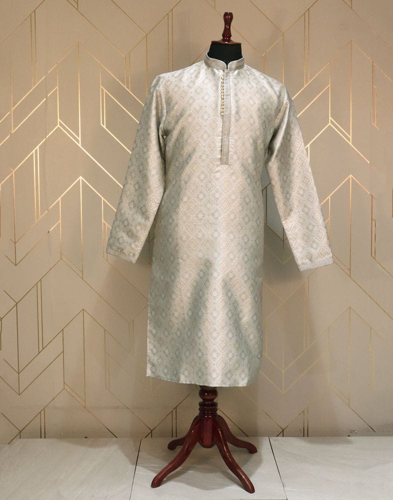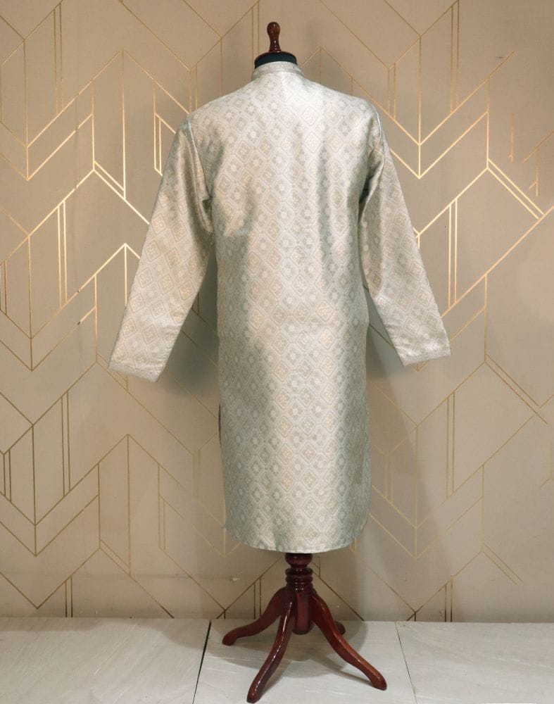 Look elegant and handsome in this Grey Floral Weave Jacquard Kurta Pyjama Set.