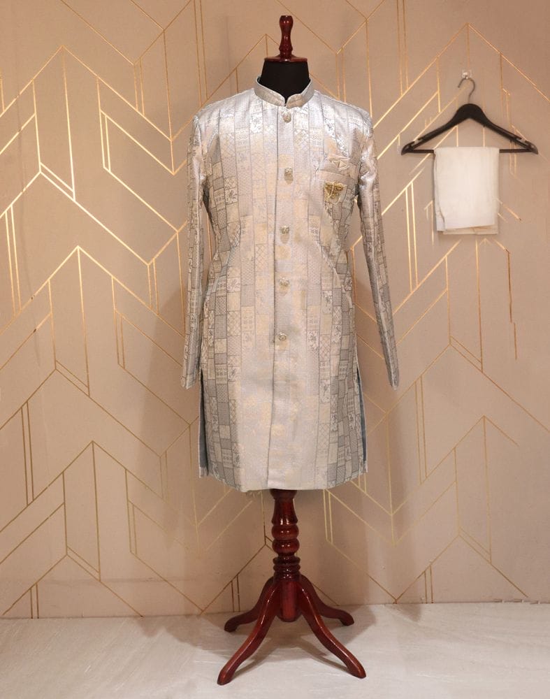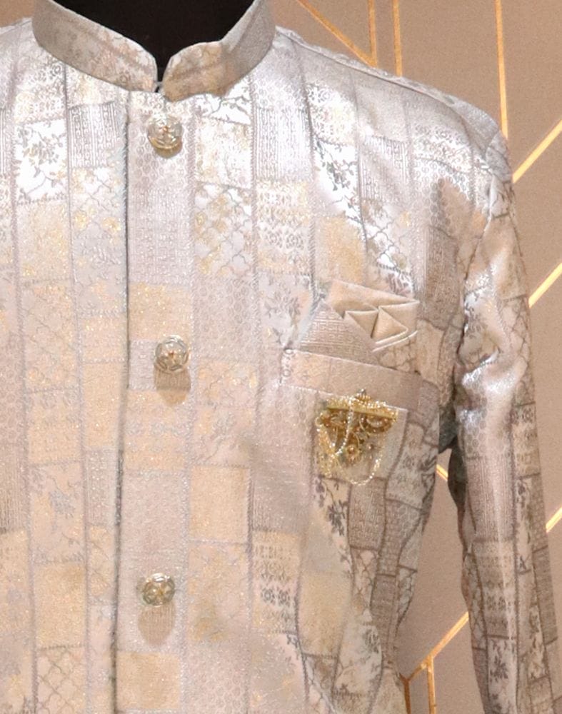 Look elegant and handsome in this Grey Self Design Weave Jacquard Indo-Western Set.