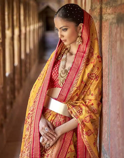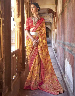 This Intriguing Mustard Botanical Print Patola Saree with the right kind of accessories gives you the best look that you would be admired for