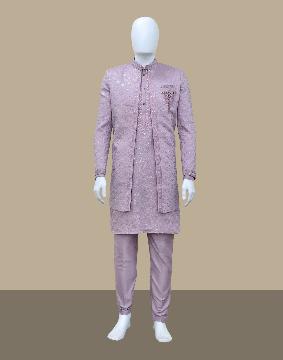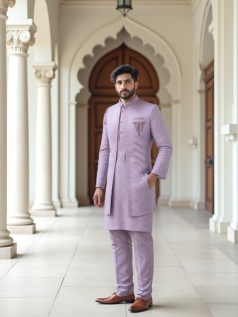 Lavender Sequinned Layered Milky Silk Indo Open Jacket Set combines elegance with modern style, featuring a luxurious milky silk base adorned with sparkling lavender sequins. The layered design creates a flowing silhouette, perfect for both formal events and festive occasions. This versatile set offers a fusion of traditional and contemporary fashion, ideal for anyone looking to make a statement.