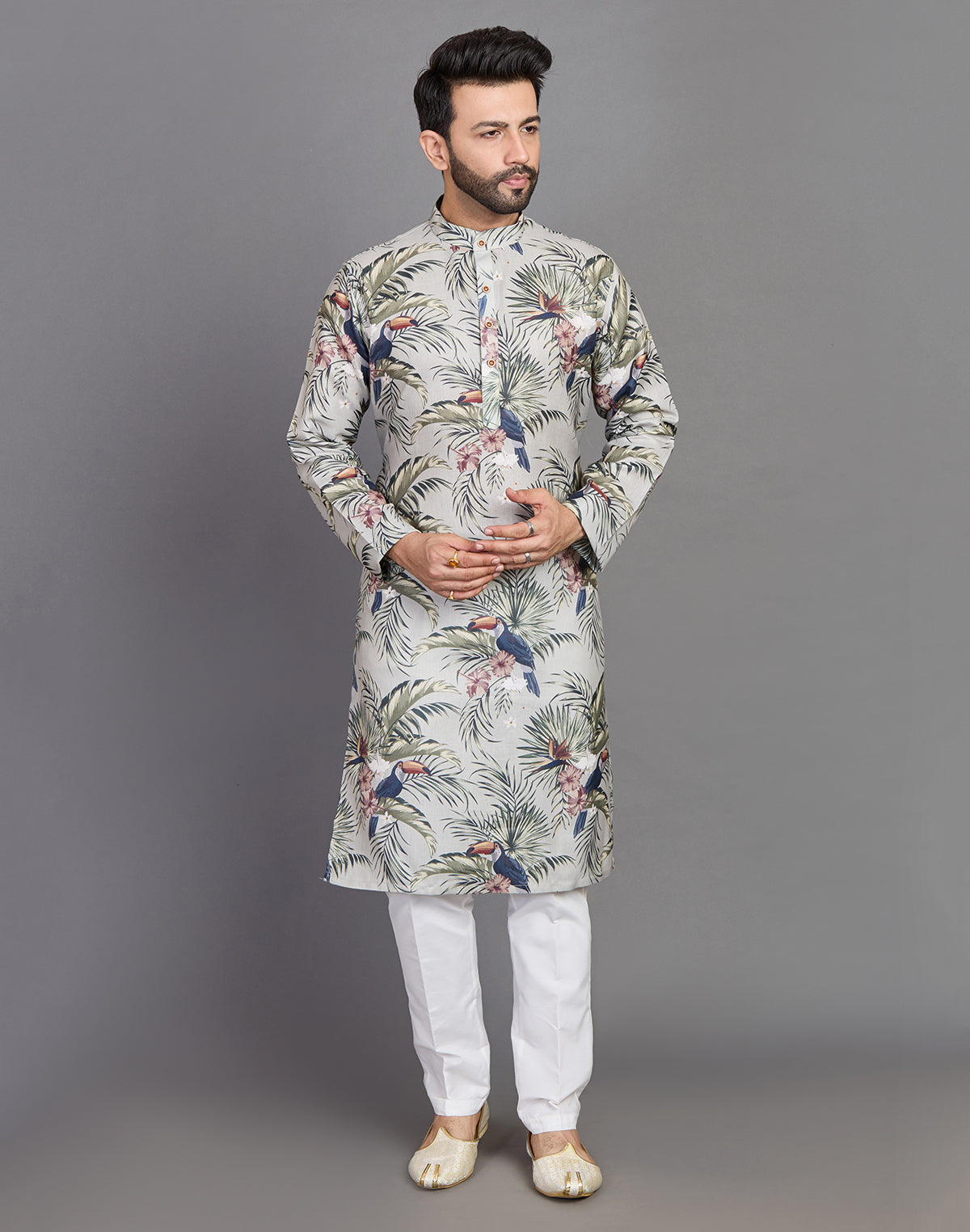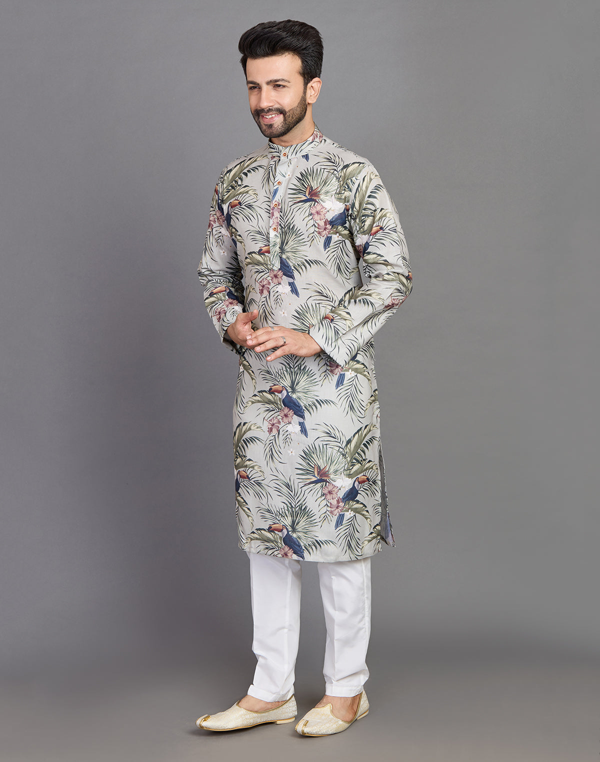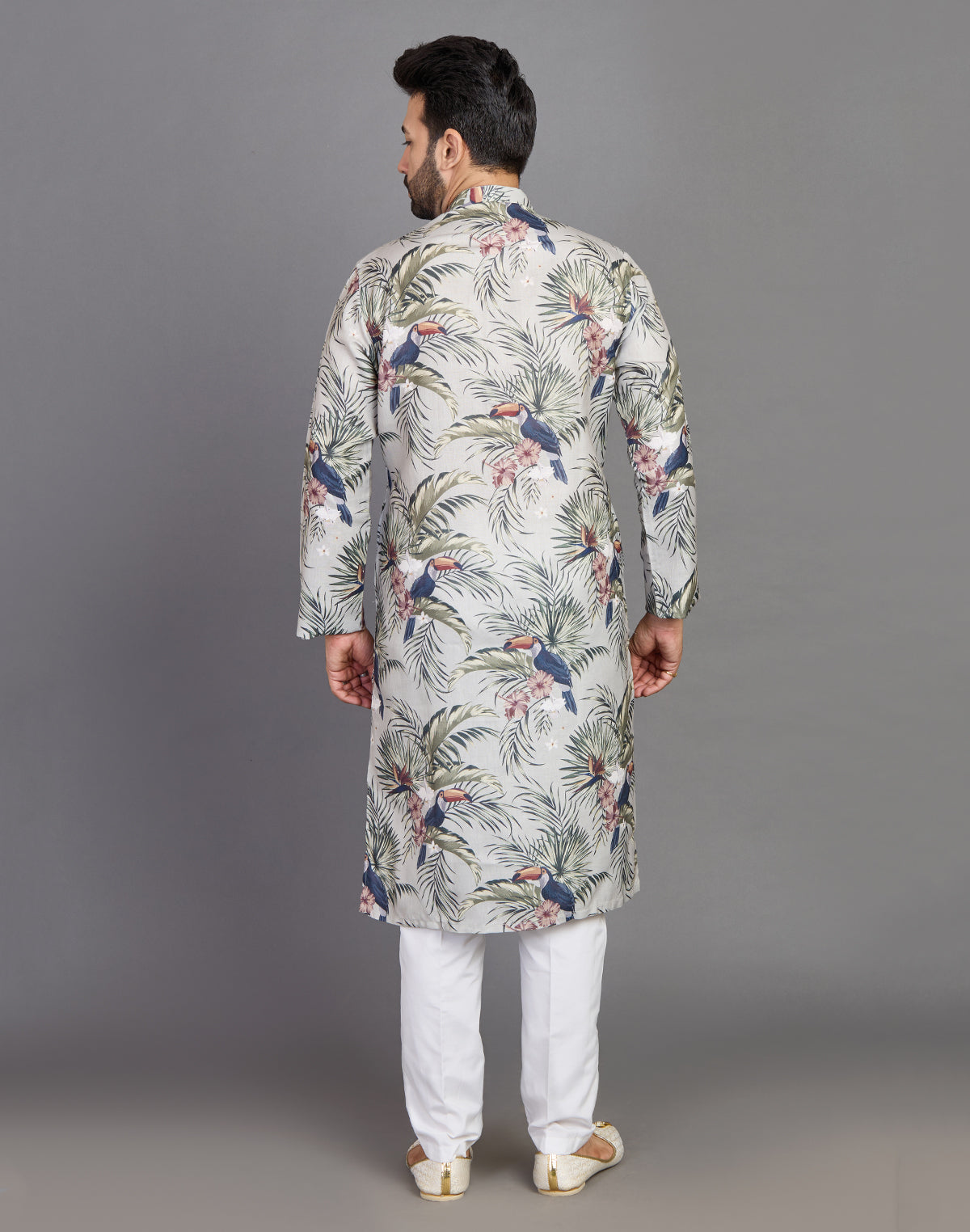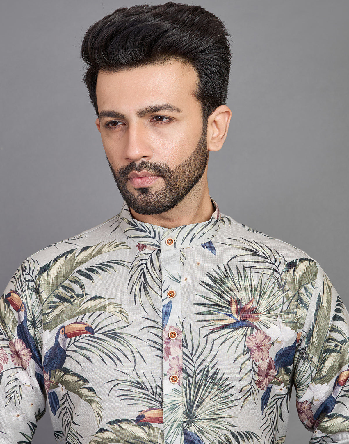 This men's cotton kurta features a stylish all-over leaf and bird pattern, blending traditional charm with a modern aesthetic. Crafted for comfort and breathability, it's perfect for both casual and festive occasions.