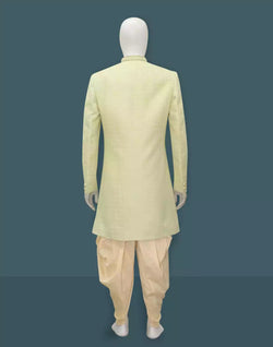 Get ready to make a statement in our Lemon Yellow Jacquard Indo Western Set, featuring intricate detailing and a stunning color combination. With a cream patiyala and mala included, this set is sure to make you the center of attention wherever you go.