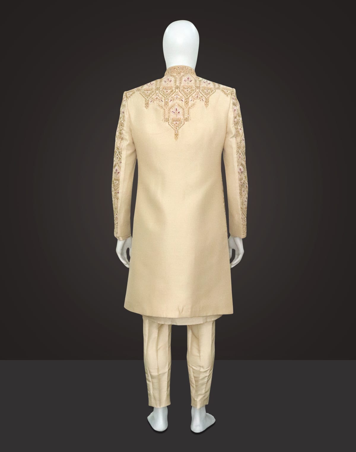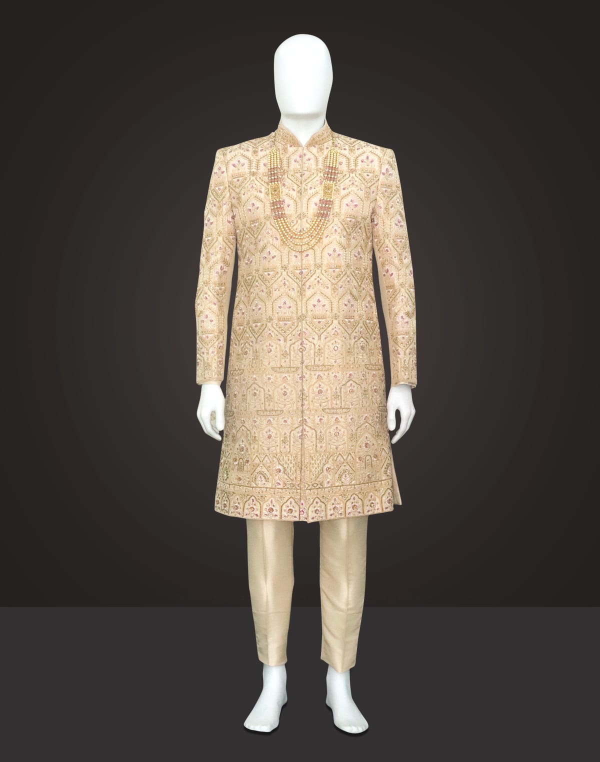 Embrace the ethnic charm with our Charming cream heavy embroidery, cutdana, beads, and stones work Indo western set with elegant mala. This piece from our latest indo styles is a perfect blend of tradition and modernity, making it an ideal choice for any groom?s wedding. Our indo western set is intricately designed with full heavy embroidery, reflecting the best indo western designs in our men?s indo western collection. The indo western, paired with a matching pyjama, adds a touch of elegance and sophistication to your ethnic ensemble. you?re investing in a timeless piece that will make you stand out on your special day. So why wait? Start your designer indo western set shopping with us and embrace the ethnic charm.