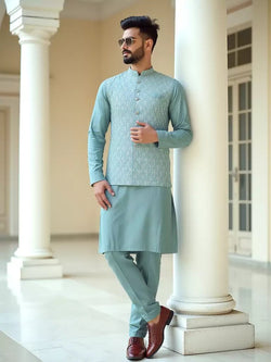 Embrace timeless elegance with our Light Green Floral Milky Silk Sequence Design Kurta Jacket Set. The beautiful floral design and subtle sequence detailing make this set a must-have for any fashion-forward individual. Crafted from lightweight silk, this set offers comfort and style in one stunning package.