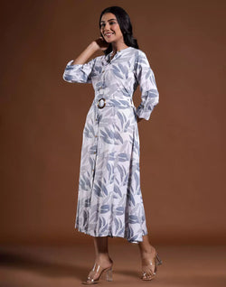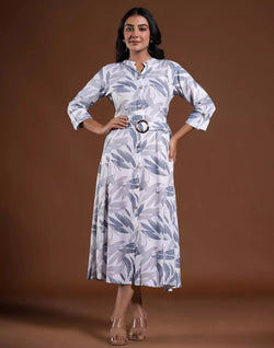 Feel comfortable in this Light Grey Cotton Silk Flared Kurti with Belt and look trendy with side pocket available.
