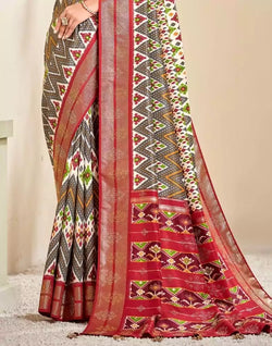 Introducing the ultimate fusion of elegance and charm - our Light Grey Ikat Print Patola Fabric Saree. This exquisite masterpiece is designed to make you stand out from the crowd with its striking ikat print in a versatile shade of light grey. Crafted with utmost precision, this saree boasts a luxurious patola fabric that drapes effortlessly, making you feel like royalty.