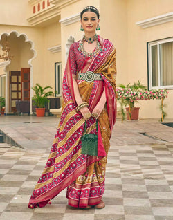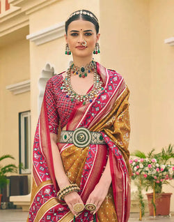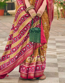 The Everglade Green Printed Patola Designer Silk Saree is an exquisite and luxurious ethnic attire that effortlessly combines traditional craftsmanship with contemporary design.