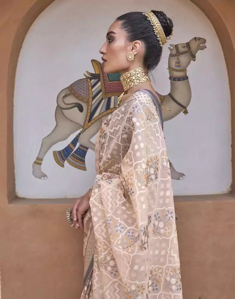This exquisite and classic Light Orange Floral Hand Painted Brasso Saree makes you look young and beautiful.