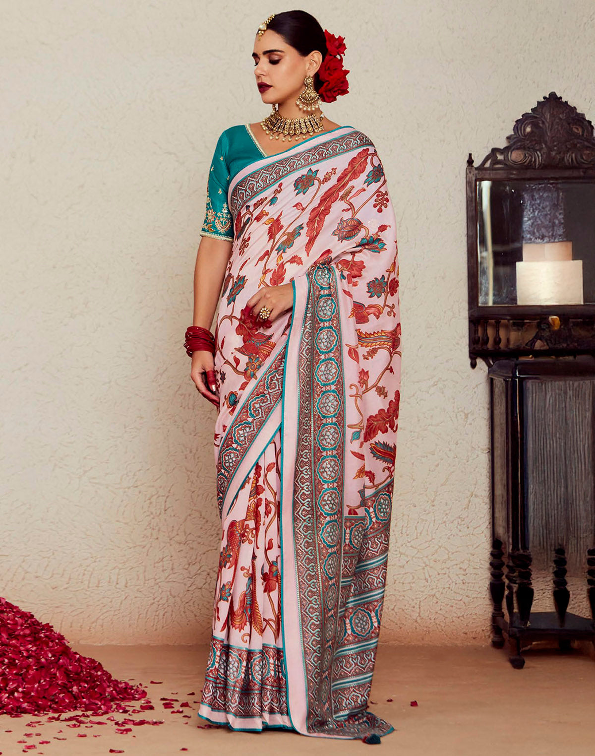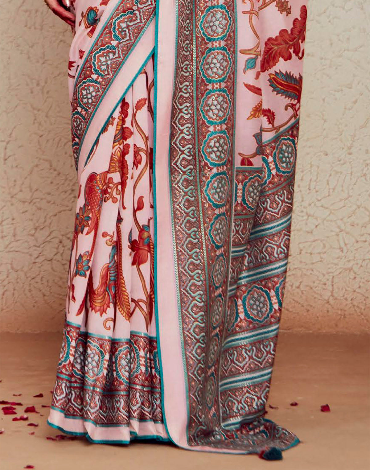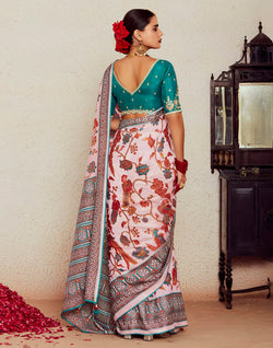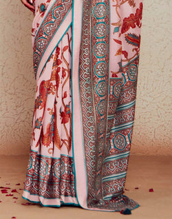 Enhance your festive and special occasion wardrobe with our light pink floral brasso silk Saree. Made from premium quality silk and featuring a gracefully designed pattern, this saree is perfect for any celebration. Complete with a designer silk blouse piece,