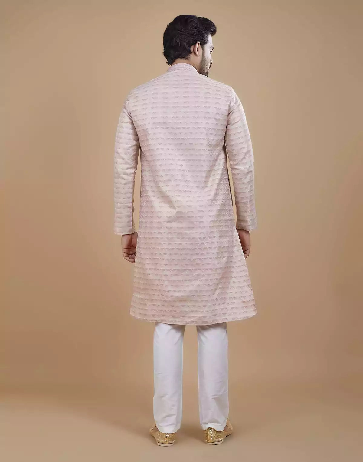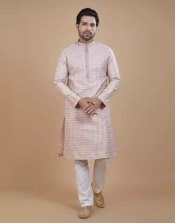 Radiate confidence as you step into any occasion wearing this captivating kurta pajama set. Its self design pattern adds a touch of originality, ensuring you stand out from the crowd with impeccable style. The gentle pastel hue complements all skin tones, creating a mesmerizing aura around you.