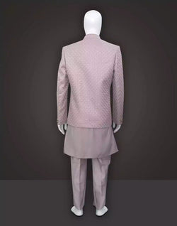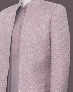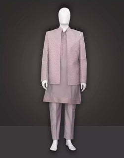 Elevate your style quotient with the Light Pink Open Jacket Embroidery work Milky Silk Fabric Indo Western. This contemporary masterpiece is designed to make you stand out on any occasion. The fusion of traditional craftsmanship and modern aesthetics creates a striking look that is perfect for gentlemen who seek a stylish edge in their wardrobe, with same color pyjama style.