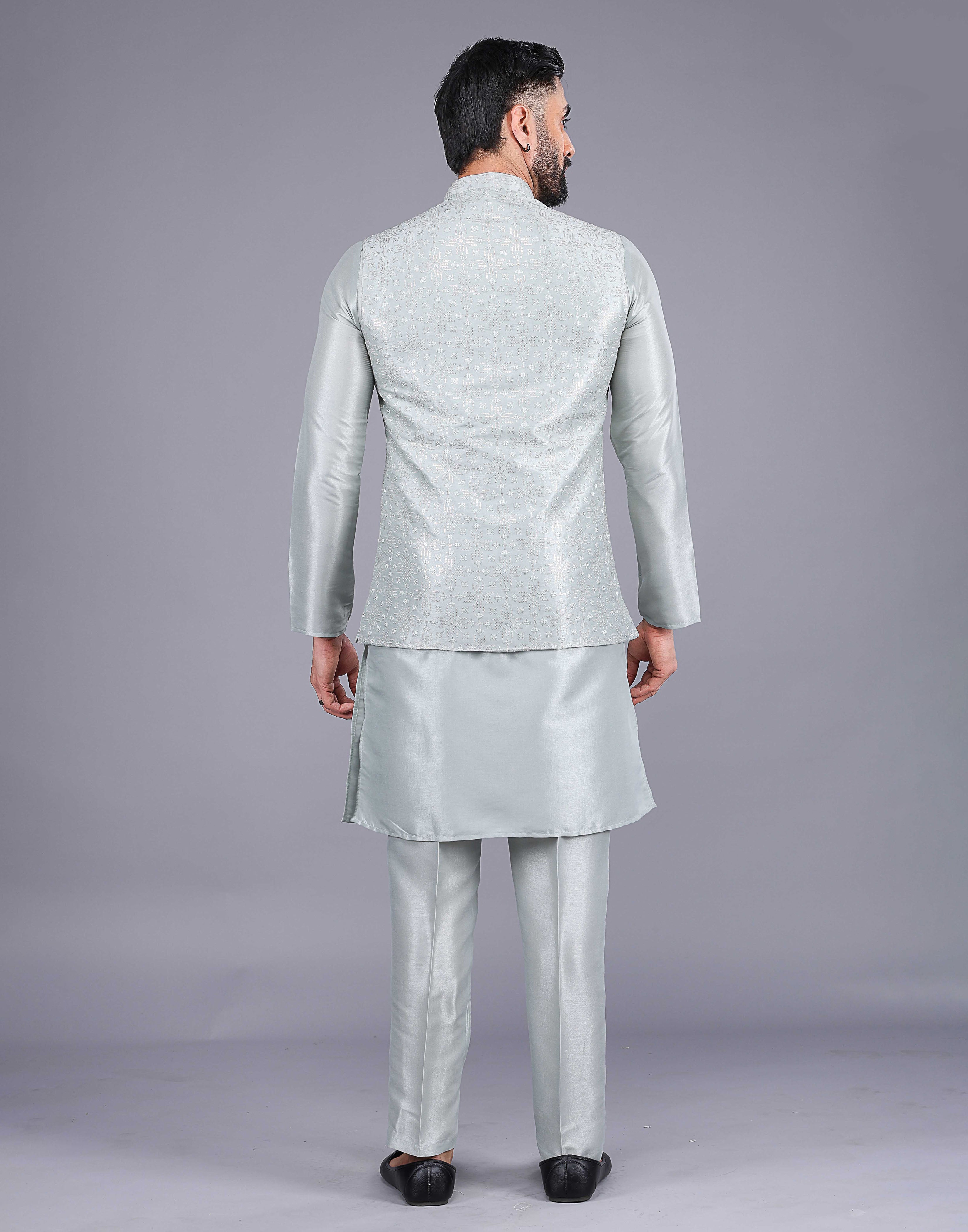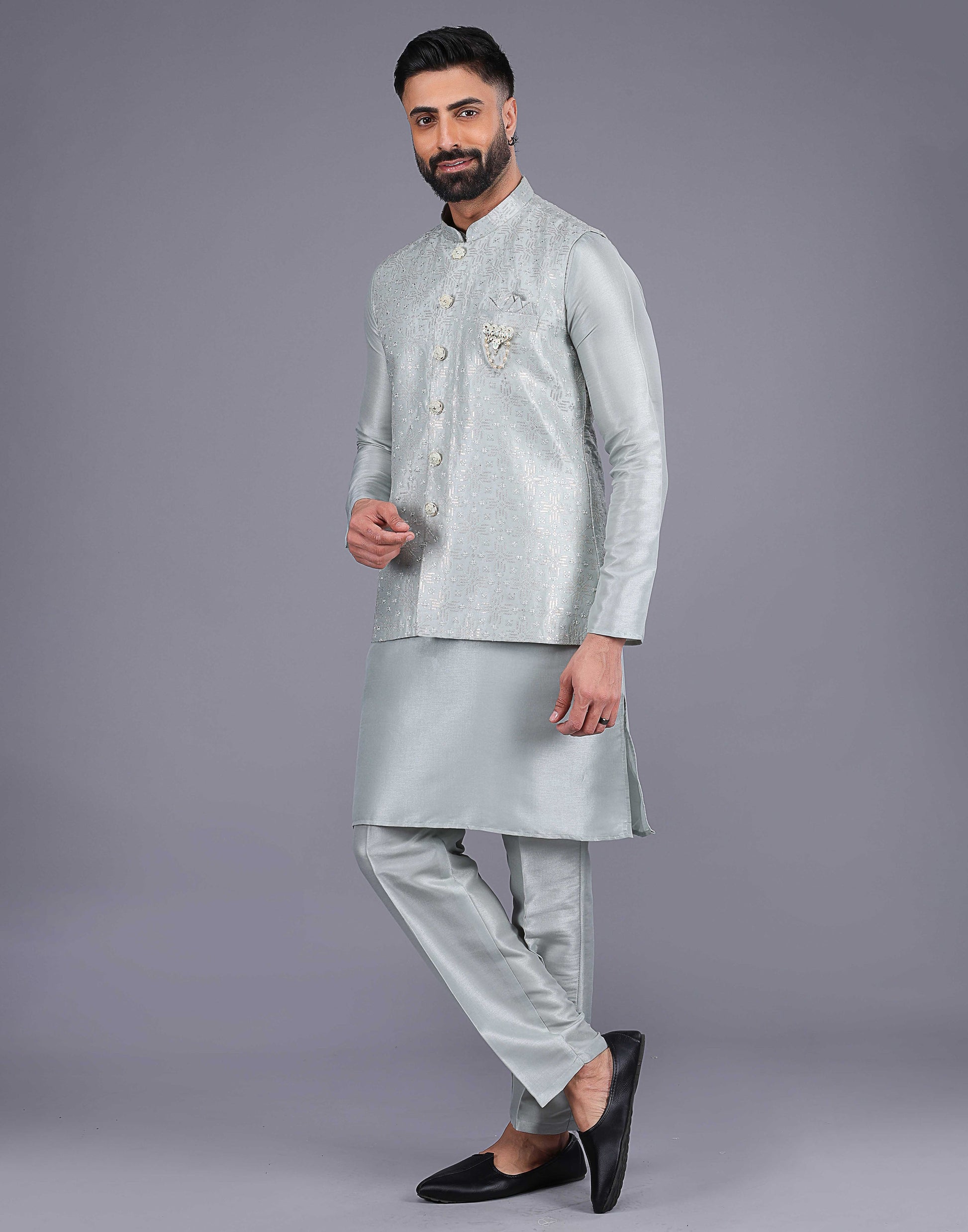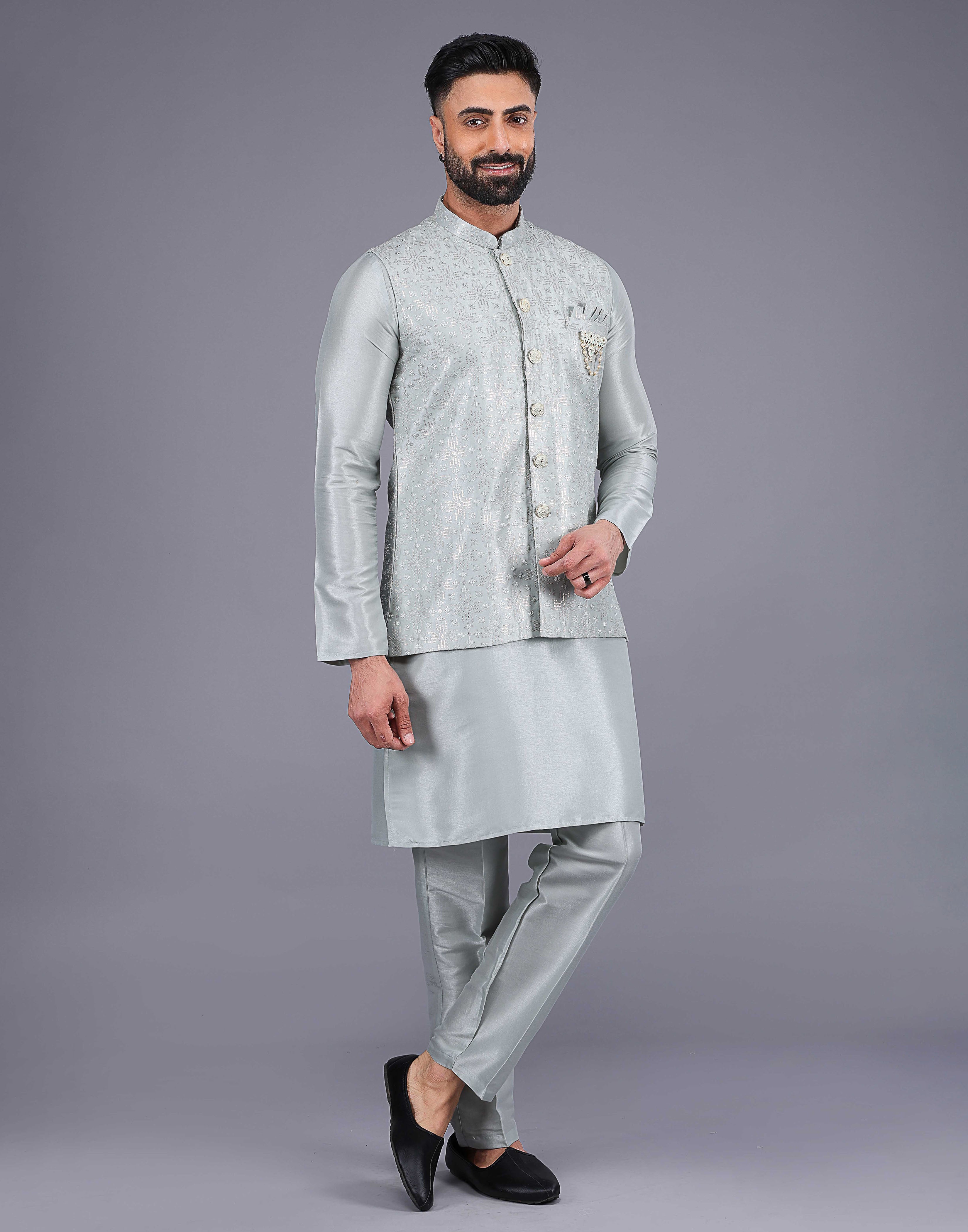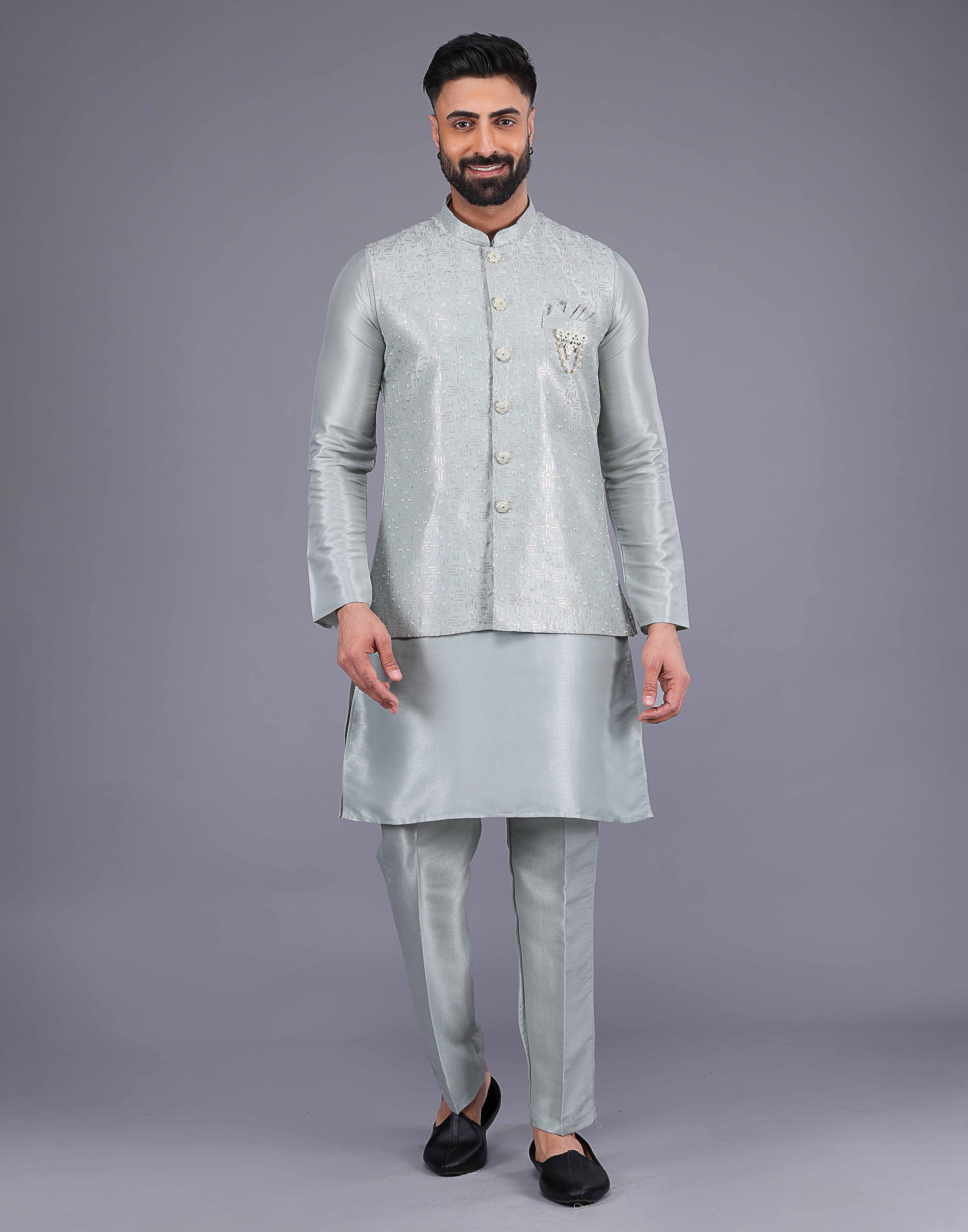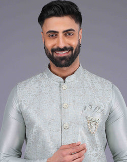 The "All Over Heavy Sequence Work Raw Silk Kurta Jacket" features intricate and detailed sequence embroidery across the entire fabric, enhancing the luxurious appeal of the raw silk. The kurta jacket combines traditional craftsmanship with a contemporary silhouette, making it perfect for festive occasions or formal gatherings. The richness of raw silk paired with heavy embellishments creates a statement piece that exudes elegance and sophistication.