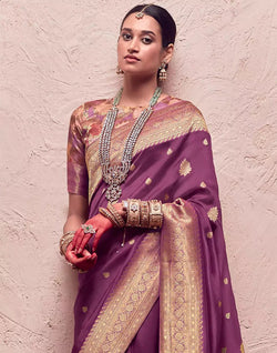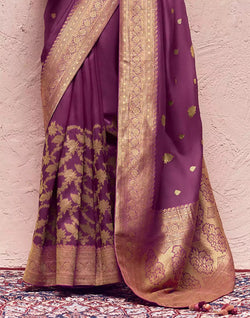 Embrace timeless elegance with our Kimora saree in a delicate light wine shade. Made from pure crepe and dola silk, this Banarasi saree is perfect for any special occasion. The vibrant multi-color blouse adds a modern touch to this classic piece.